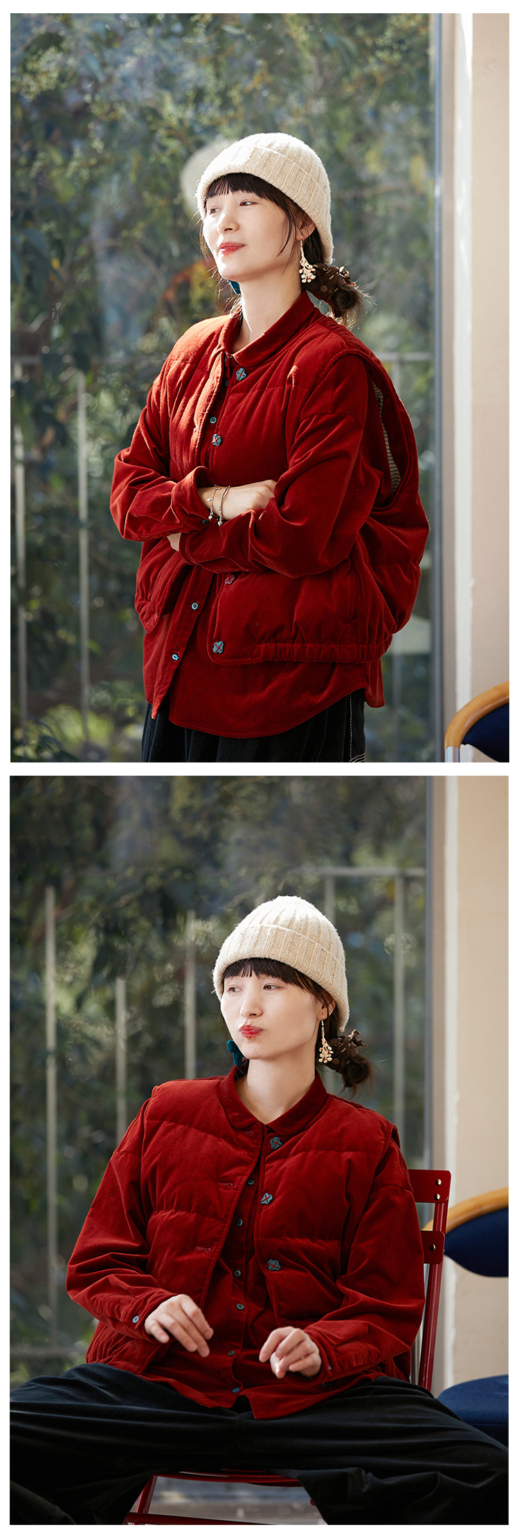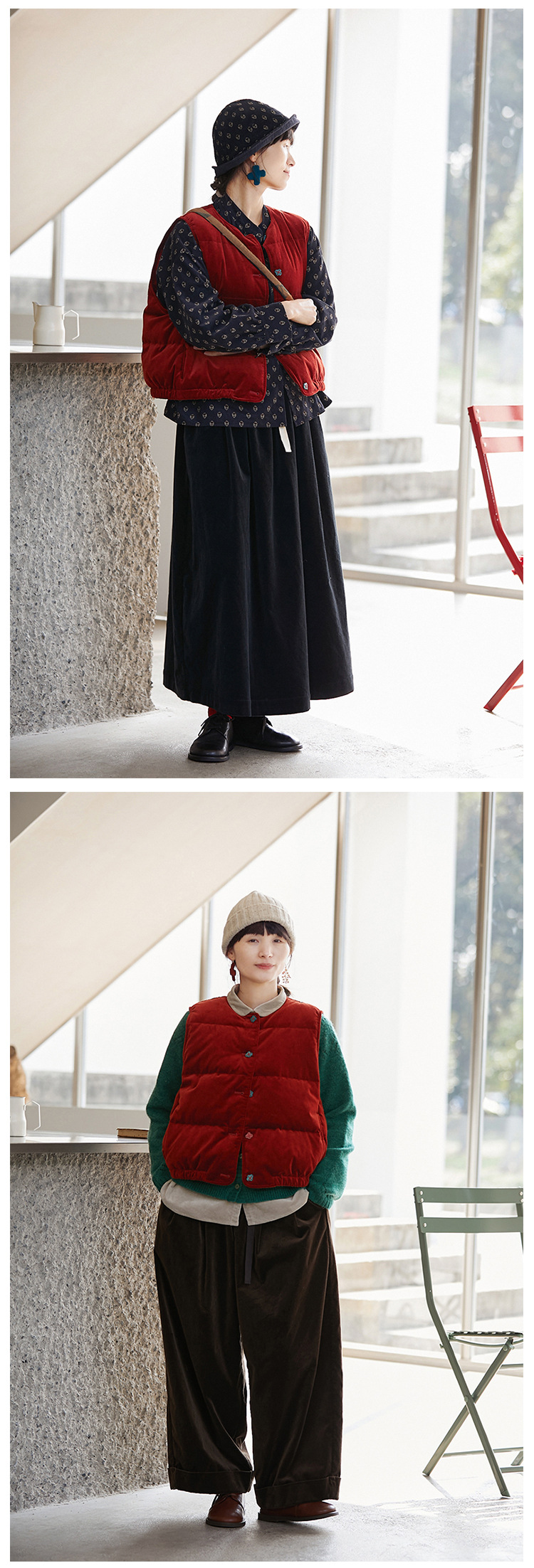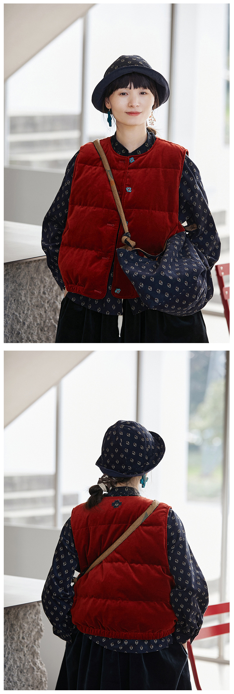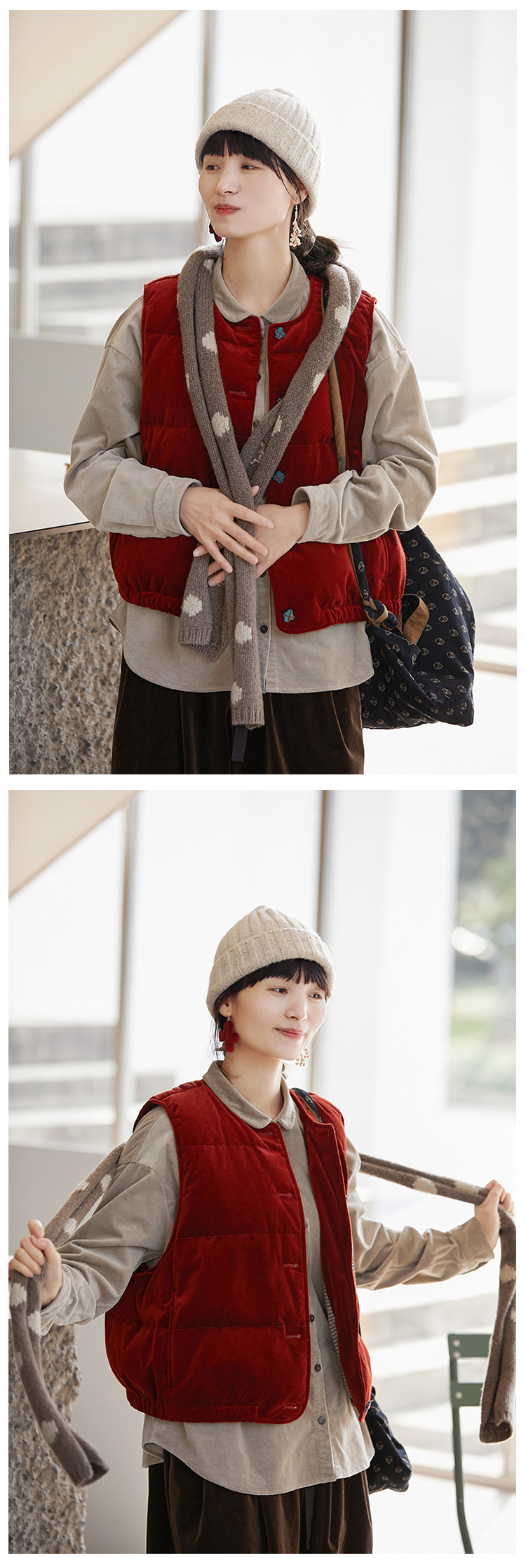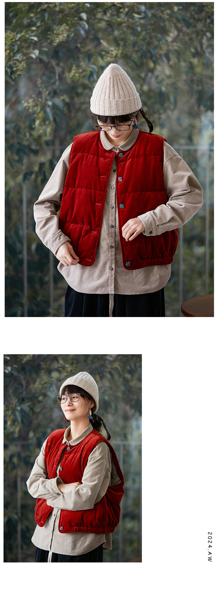 壹旧原著【杂想】冬款丝绒红平绒棉宽松保暖亲肤羽绒女马甲9292B