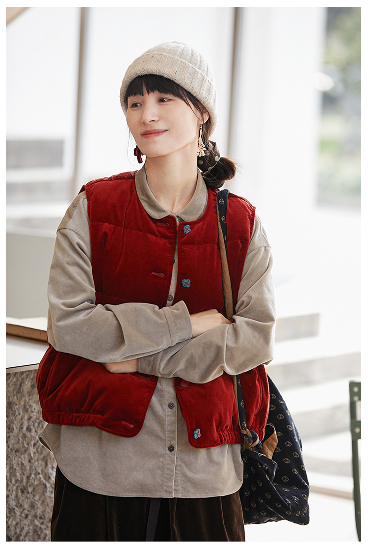 겨울 새로운 예술 레트로 오리지널 여성 캐주얼 벨벳 레드 플랫 코튼 느슨한 따뜻한 피부 친화적 인 여성 조끼