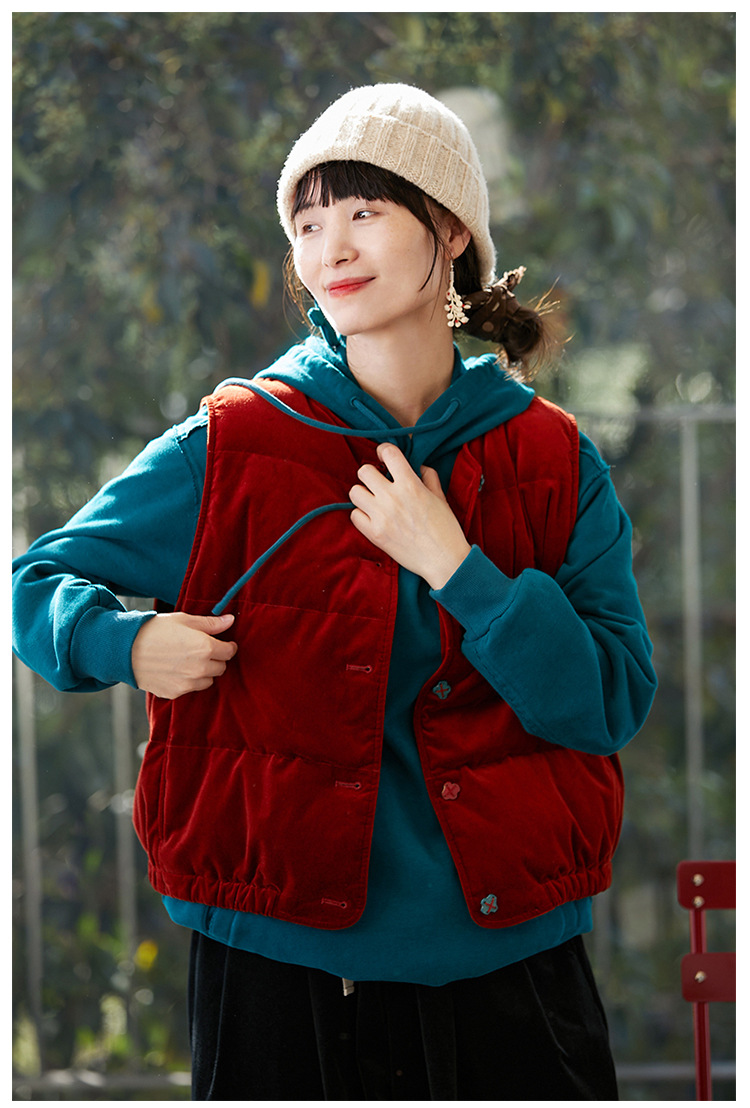 겨울 새로운 예술 레트로 오리지널 여성 캐주얼 벨벳 레드 플랫 코튼 느슨한 따뜻한 피부 친화적 인 여성 조끼스토어 가기