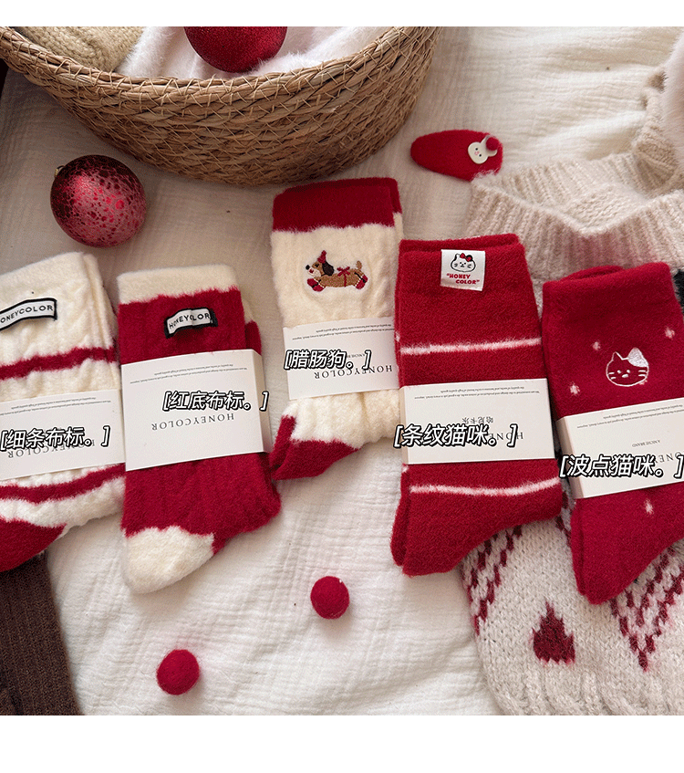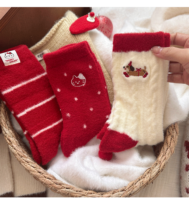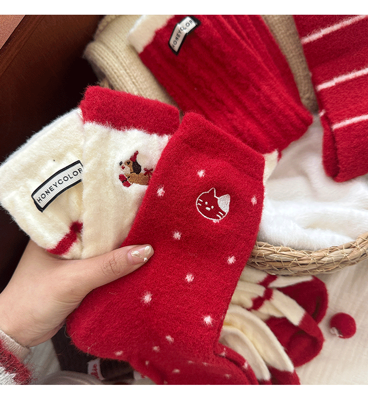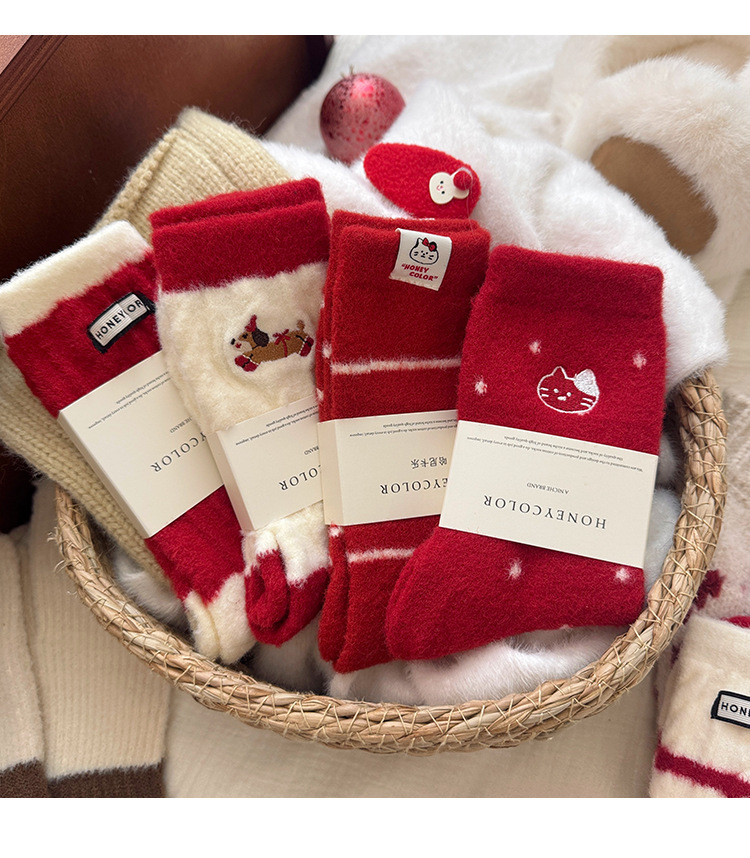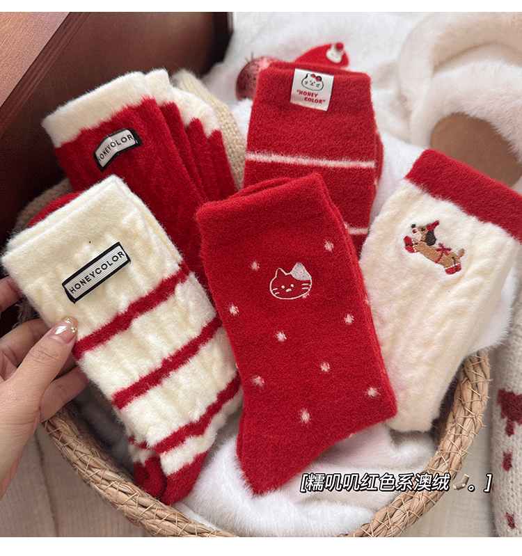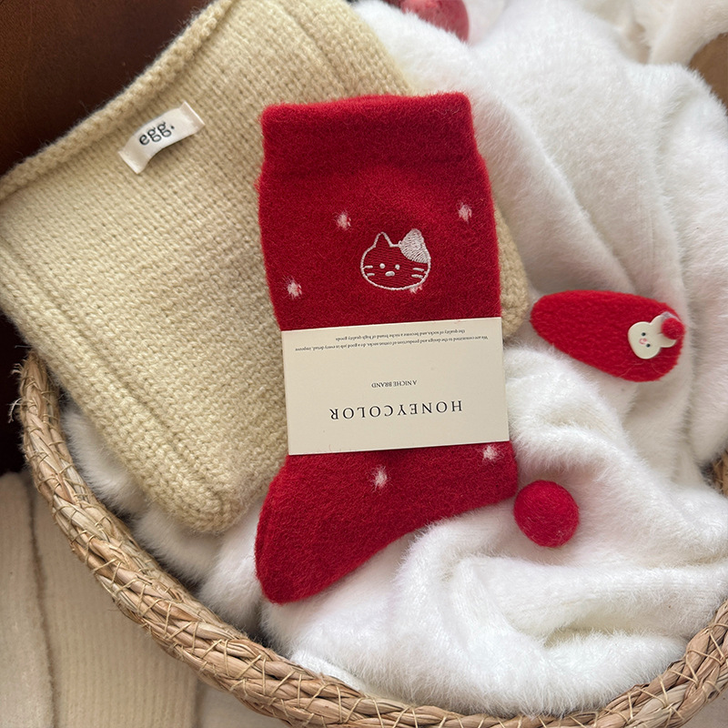 Waxy Jiji Red "호주 벨벳 양말 어린이 미드 튜브 양말 가을과 겨울 두꺼운 자수 고양이 홈 귀여운 수면 양말