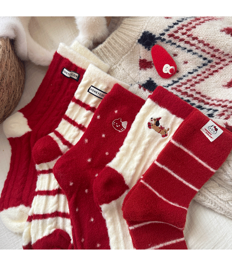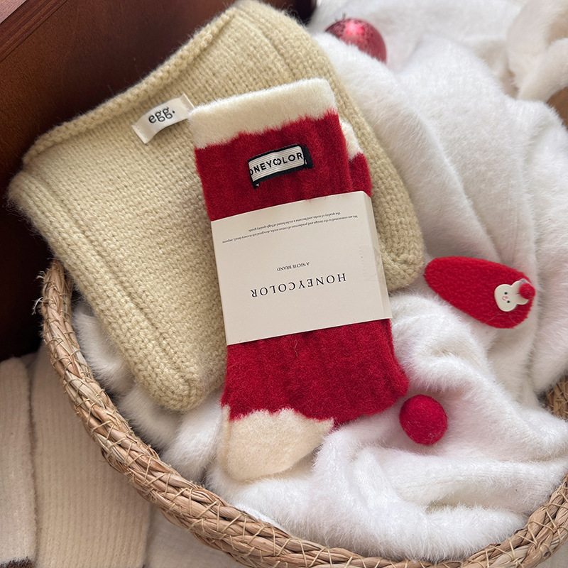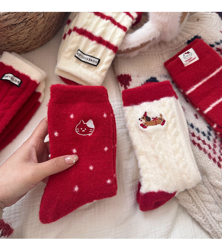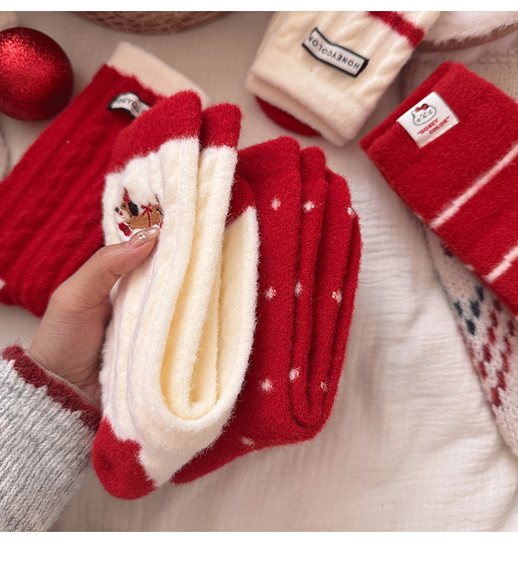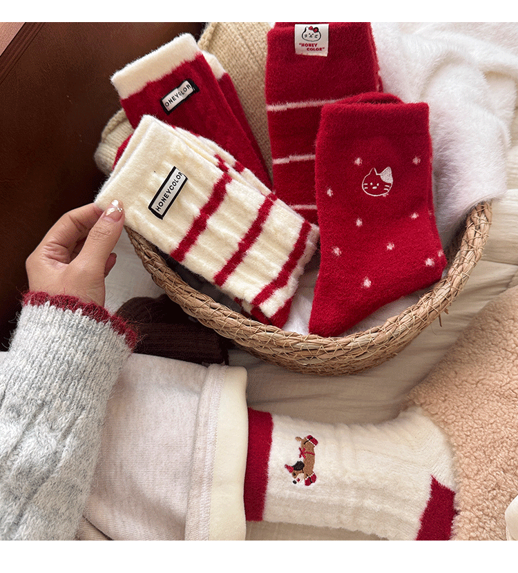 Waxy Jiji Red "호주 벨벳 양말 어린이 미드 튜브 양말 가을과 겨울 두꺼운 자수 고양이 홈 귀여운 수면 양말