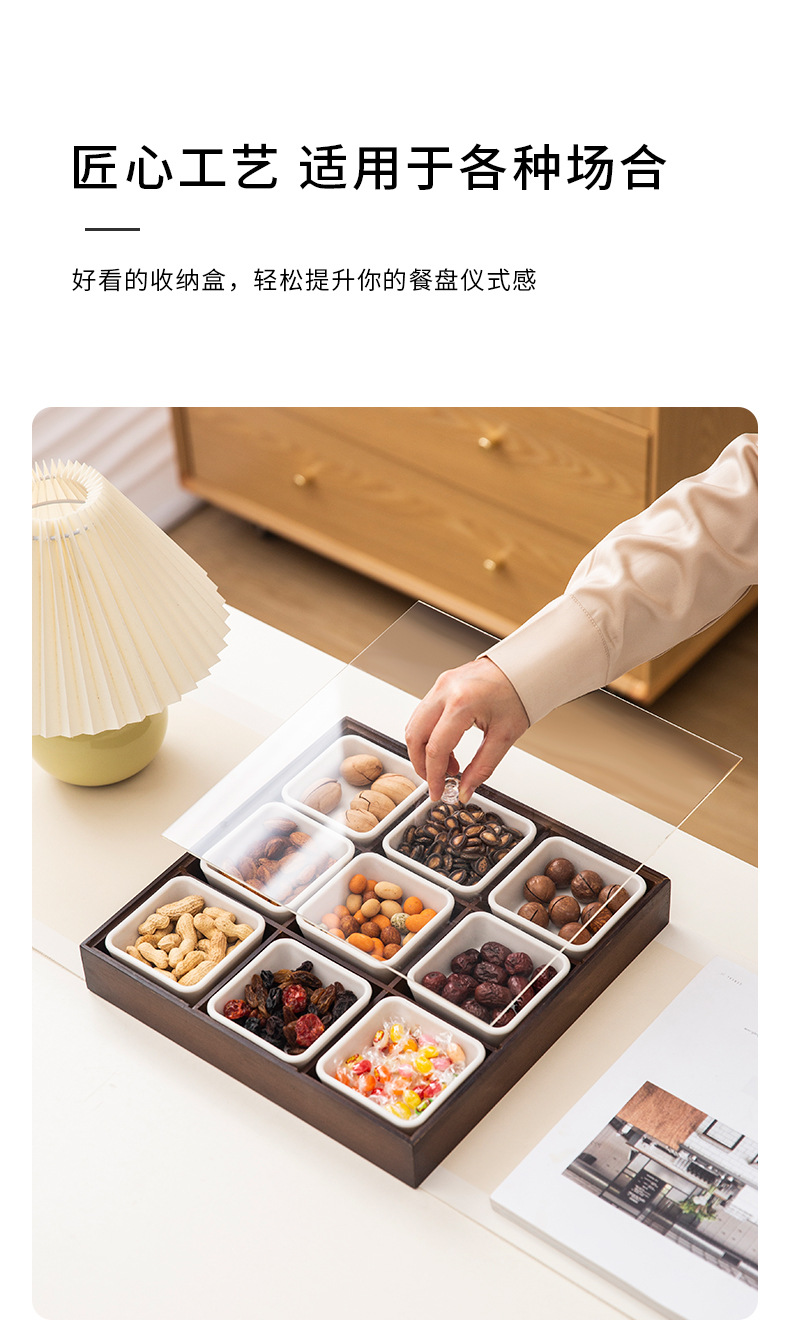 • 호두나무 색상 9칸 뚜껑 달린 다과 트레이 (흰색 나비 장식 포함)