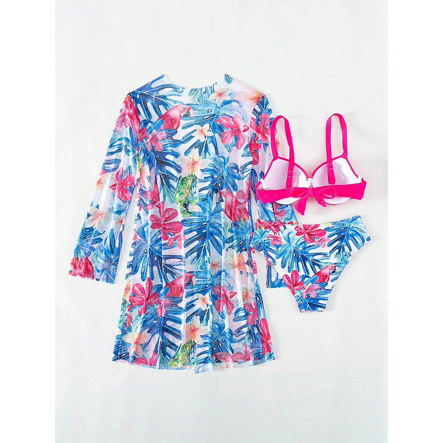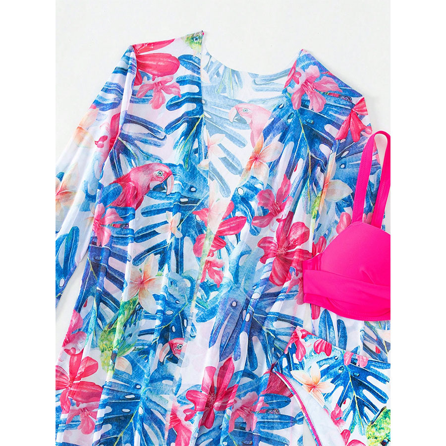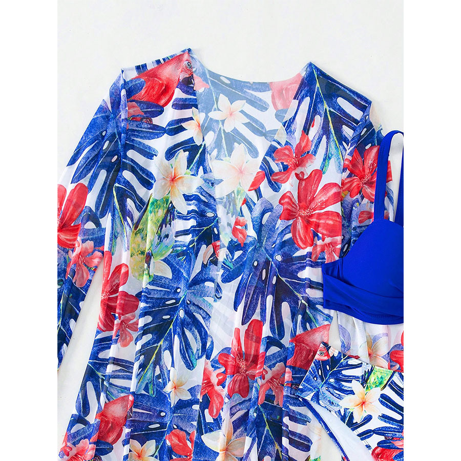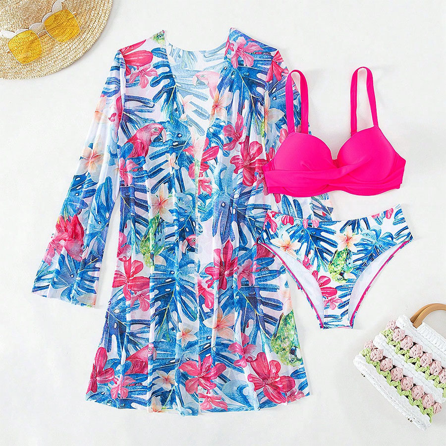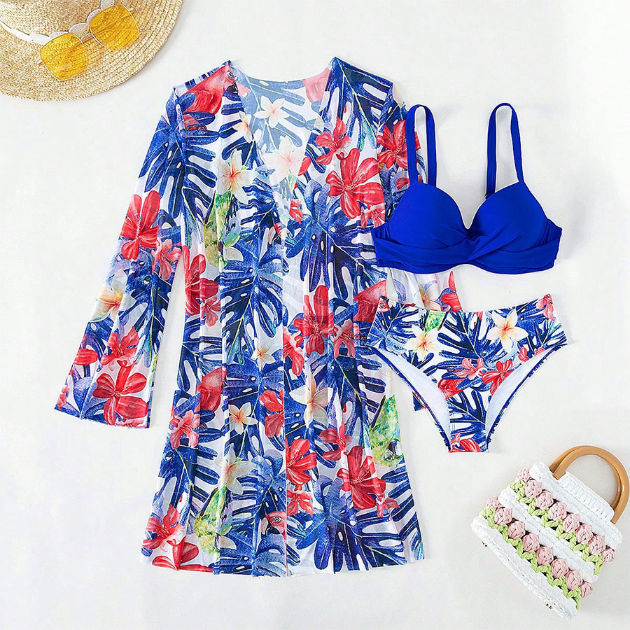 2025 유럽과 미국 단일 섹시한 강철 지원은 높은 허리 인쇄 휴일 선 스크린 블라우스 3 피스 분할 수영복 여성을 모았습니다.