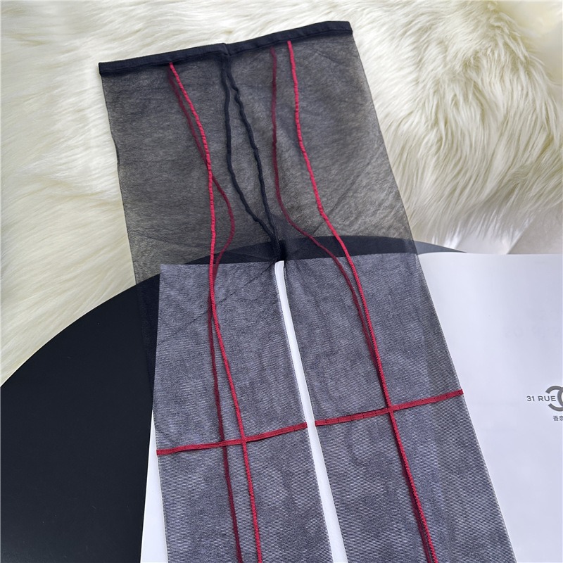 섹시한 뜨거운 여자 크로스 새우 라인 스타킹 여성의 순수한 높은 투명한 검은 실크 다리 슬리밍 매우 얇은 빨간 수직 라인 팬티 스타킹스토어 가기