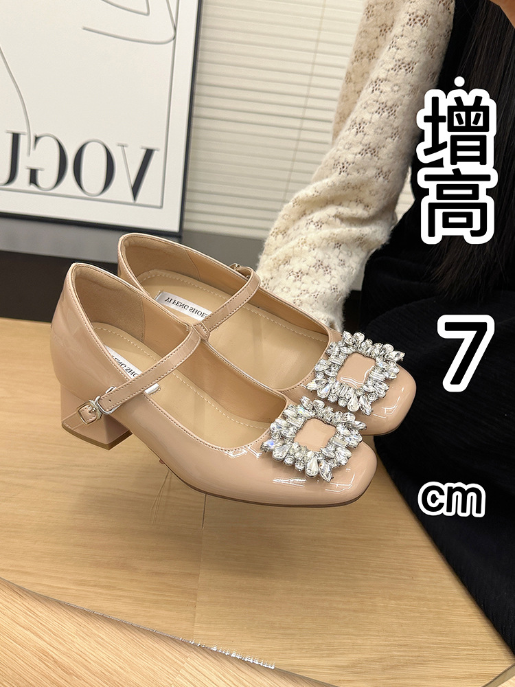 두꺼운 힐 높이 증가 7CM 프랑스 메리 제인 신발 여성의 2025 봄 새 광장 버클 라인스톤 작은 하이힐스토어 가기