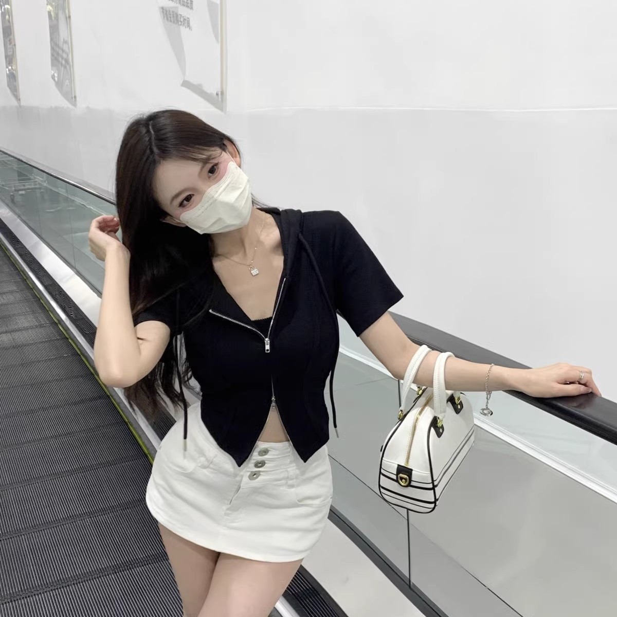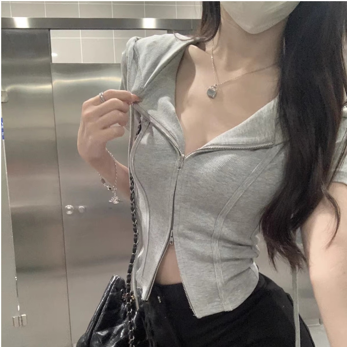 순수한 달콤한 쿨 핫 소녀 후드 쇼트 코트 여성용 V-Neck 더블 지퍼 타이트 허리 반팔 카디건 자른 탑