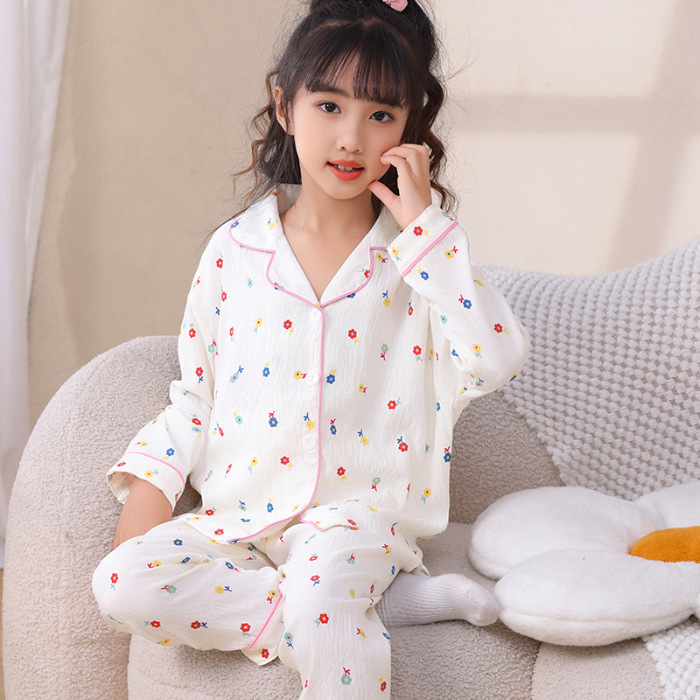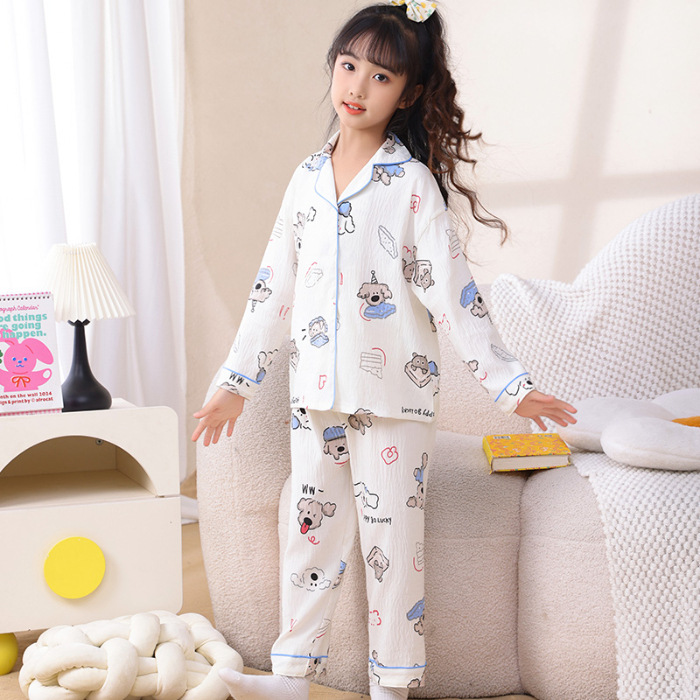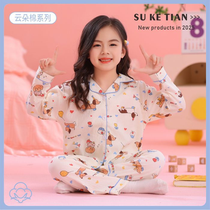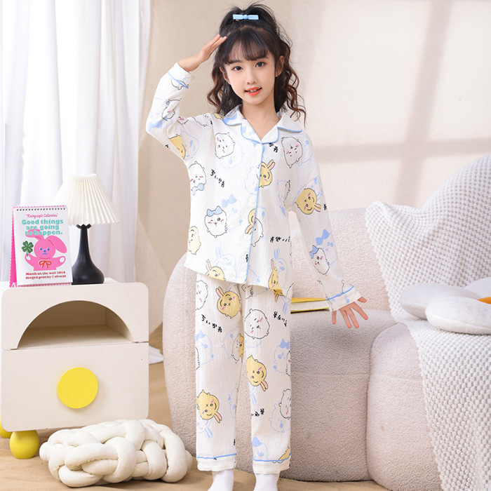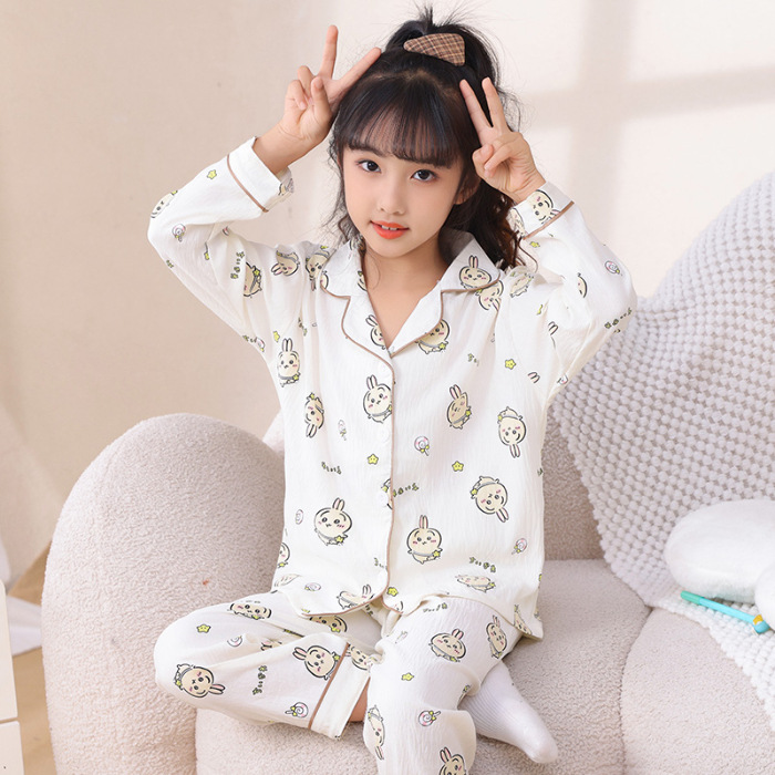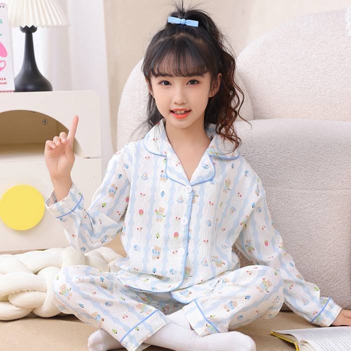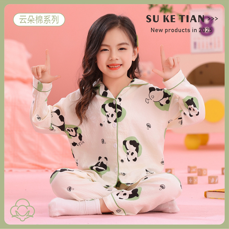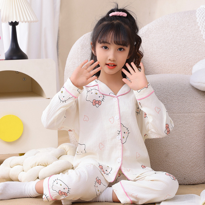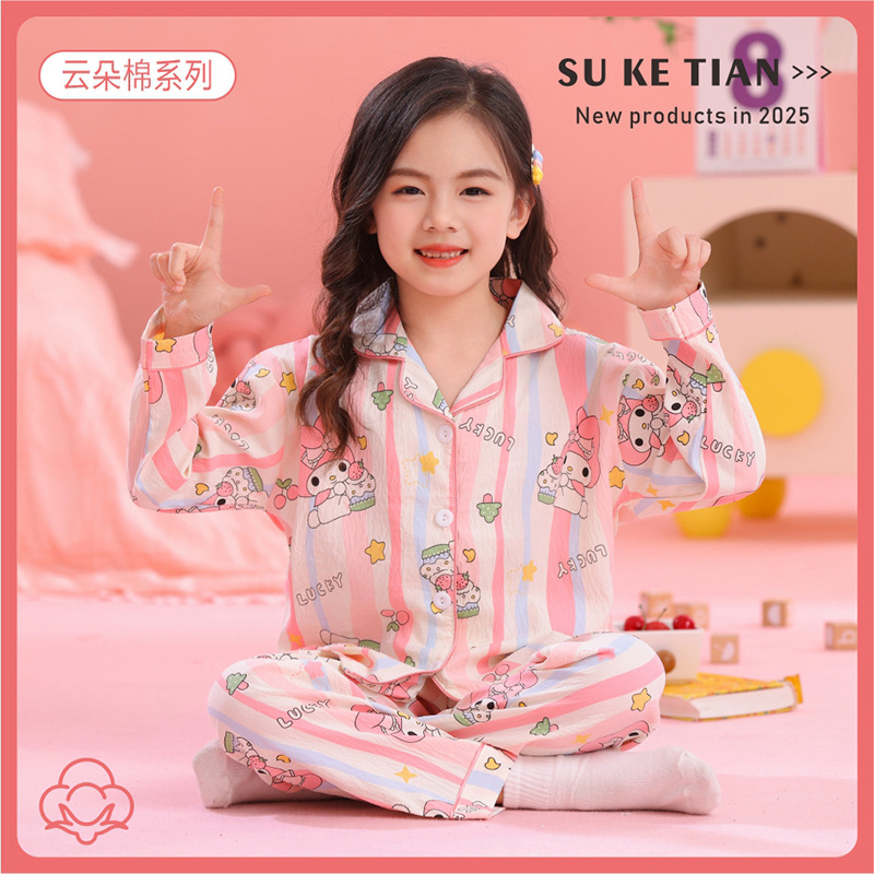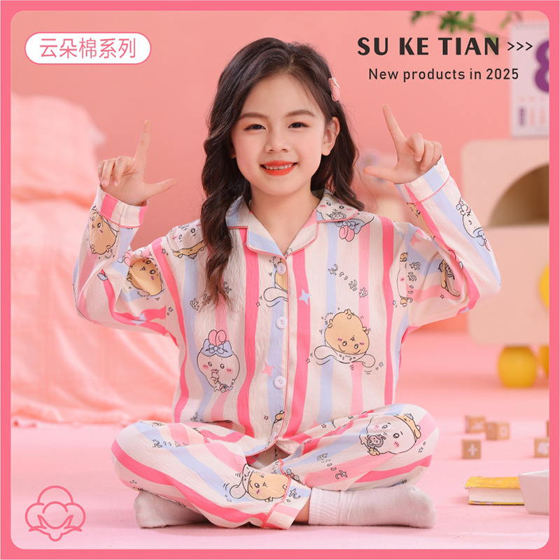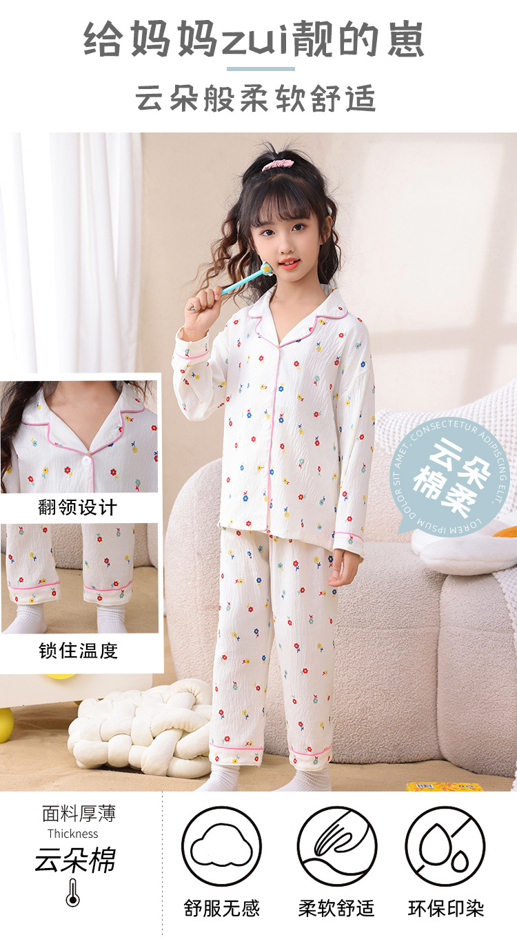 봄과 가을 어린이 잠옷 소녀의 구름 면화 홈 옷 옷깃 카디건 얇은 세트 만화 소녀 중 큰 아이들