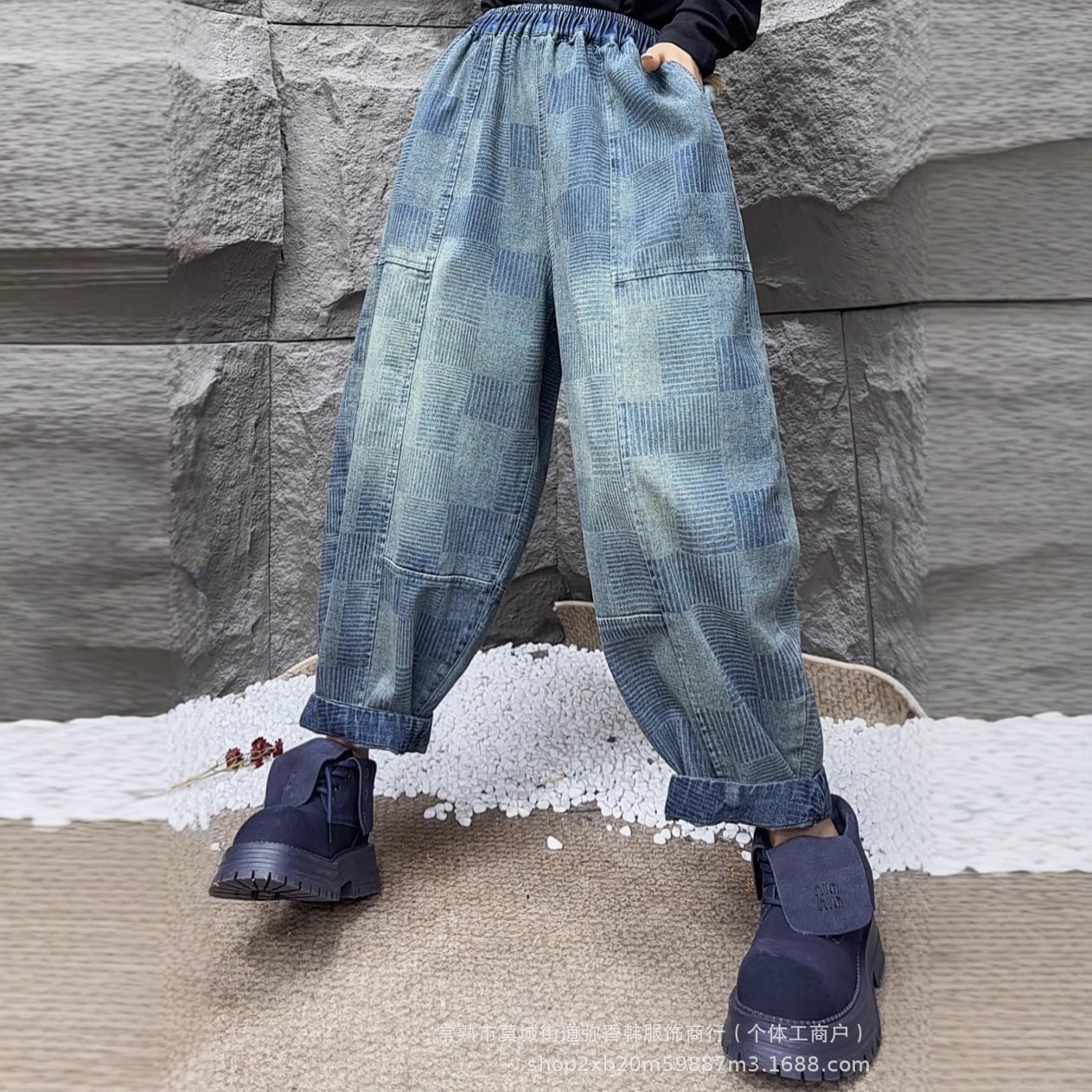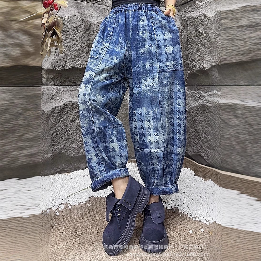 2025 봄 빈티지 격자 무늬 프린트 청바지 여성용 탄성 허리 흰색 스티칭 슬림 하렘 바지스토어 가기