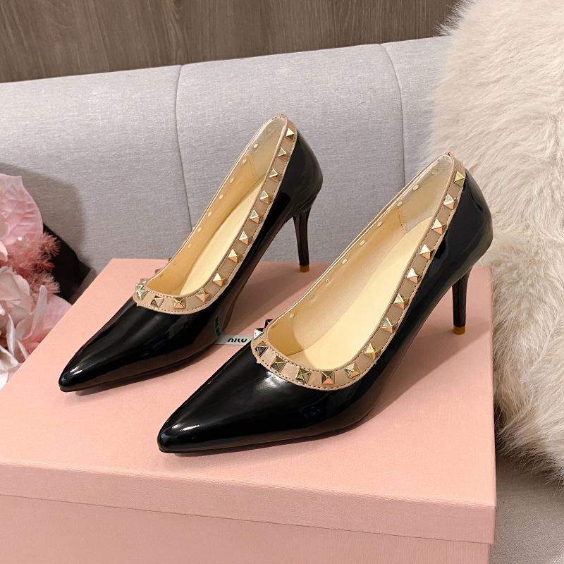 리벳은 검은 하이힐을 가리키며 2025 새로운 패션 얕은 스틸레토 힐 신발 프랑스 우아한 전문 특허 가죽 신발스토어 가기