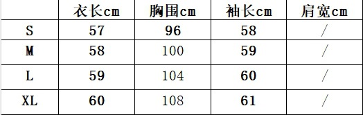 均码:衣长58CM 胸围100CM 连肩袖长59CM