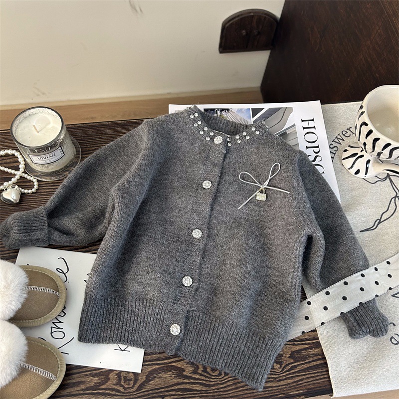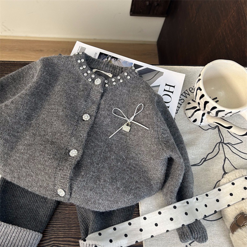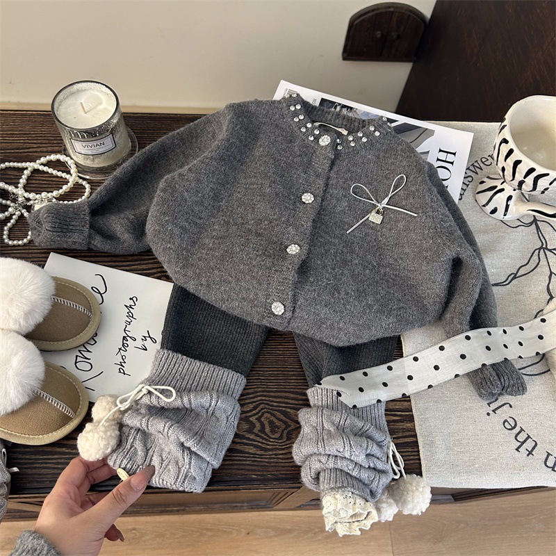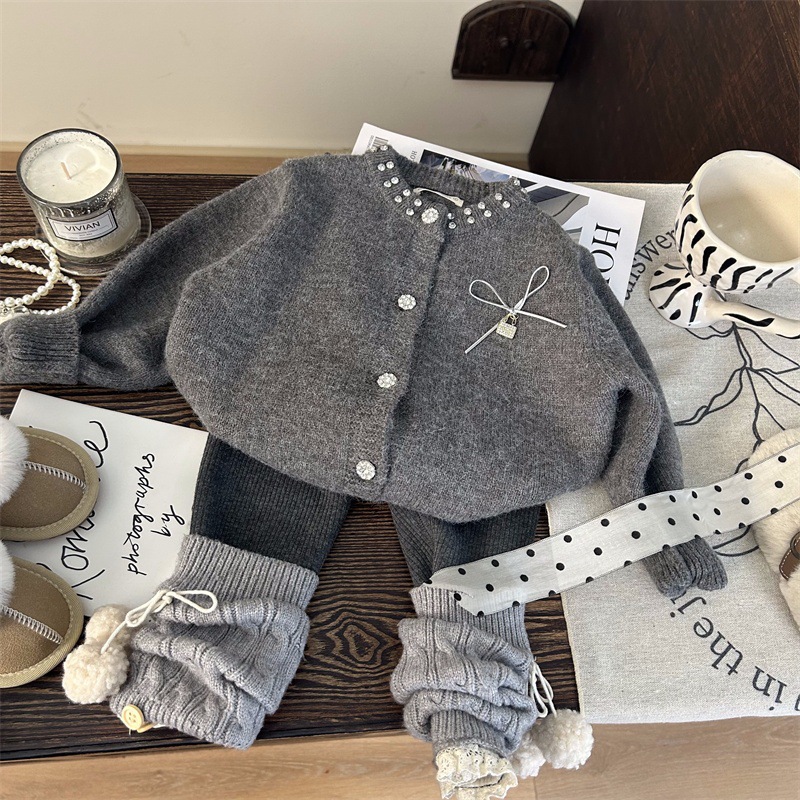 재고정리, 반품교환 불가【합리적인 주문】겨울 여아 리본 스웨터 가디건+플리스 레깅스스토어 가기