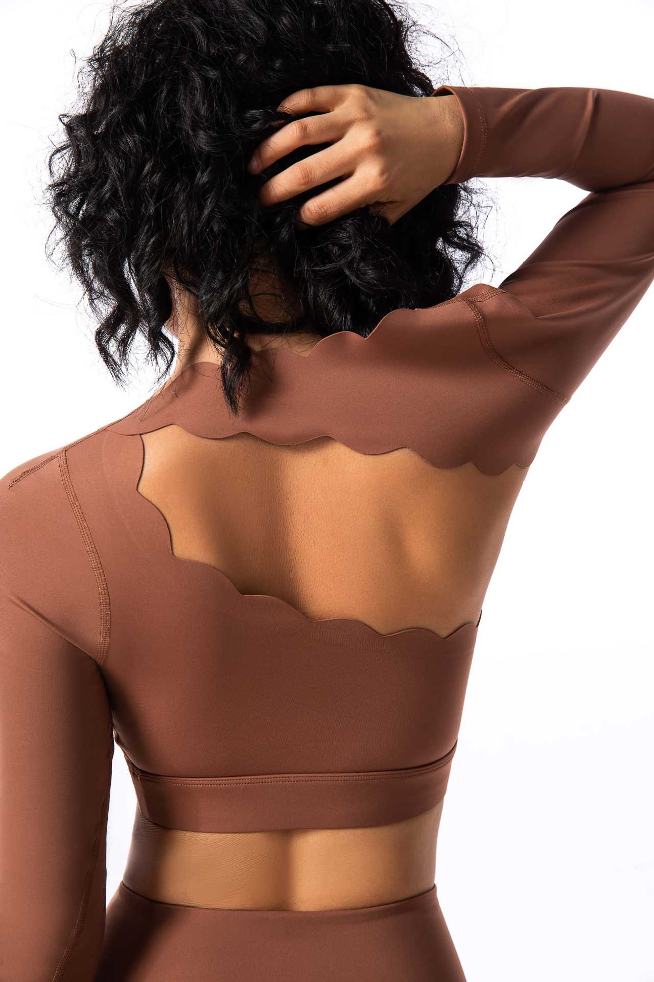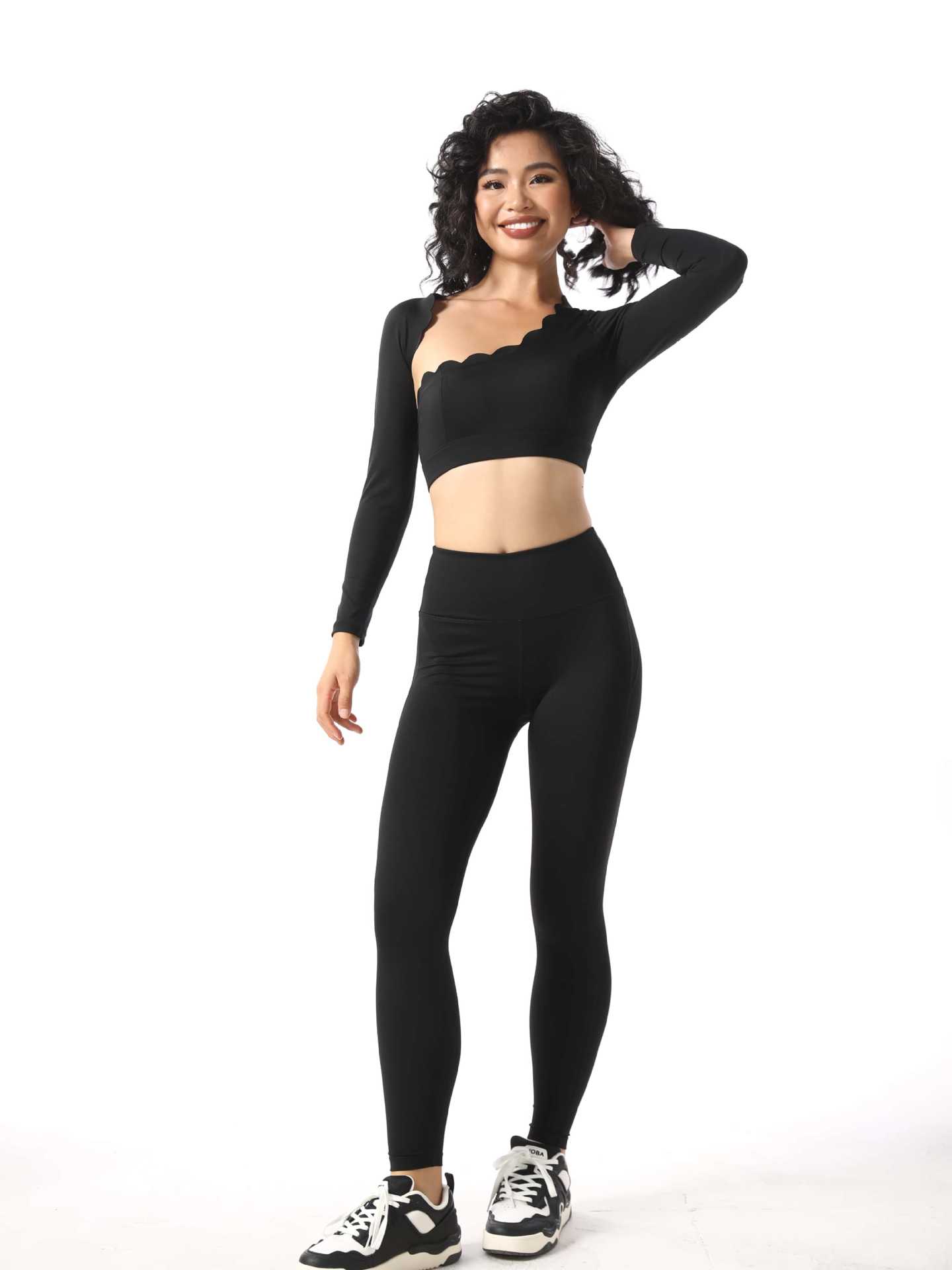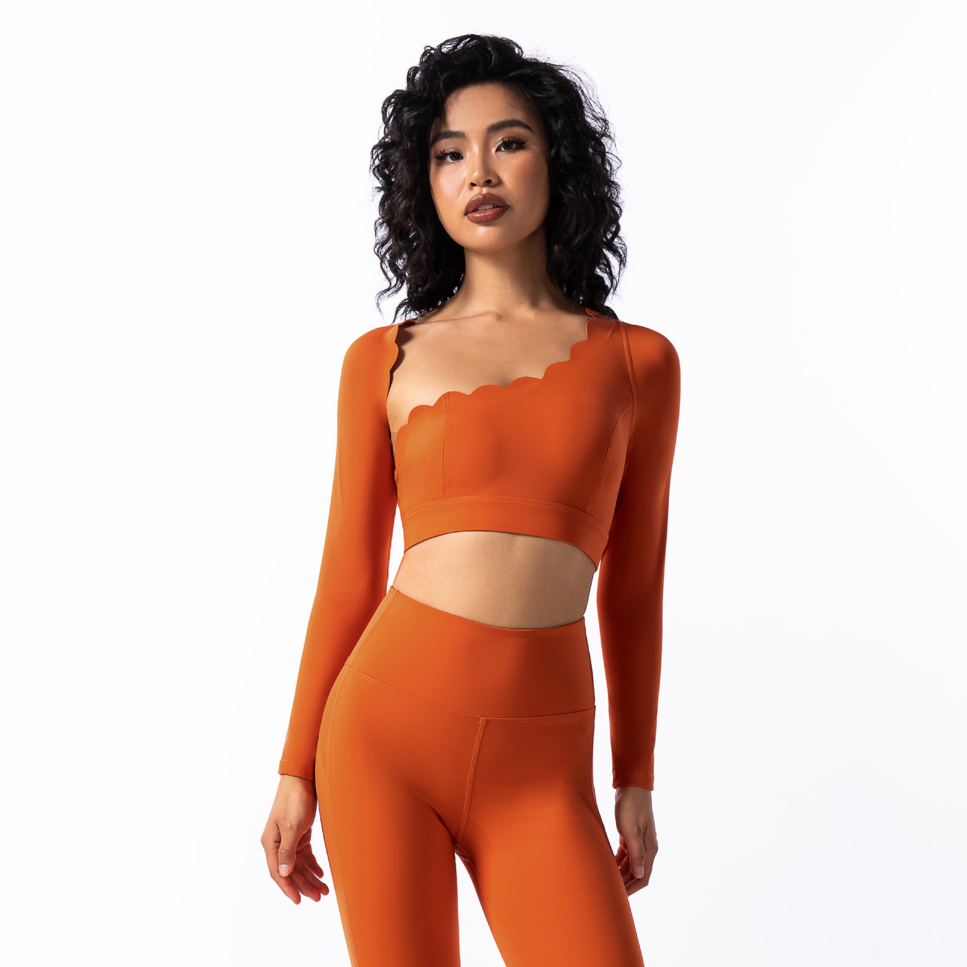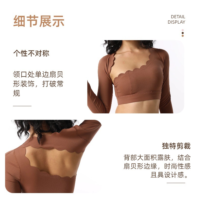 달리기 피트니스 스포츠 요가 세트 디자인 크로스 오버 어깨 상단 여성용 편안한 피부 친화적 인 통기성 충격 방지 긴 소매