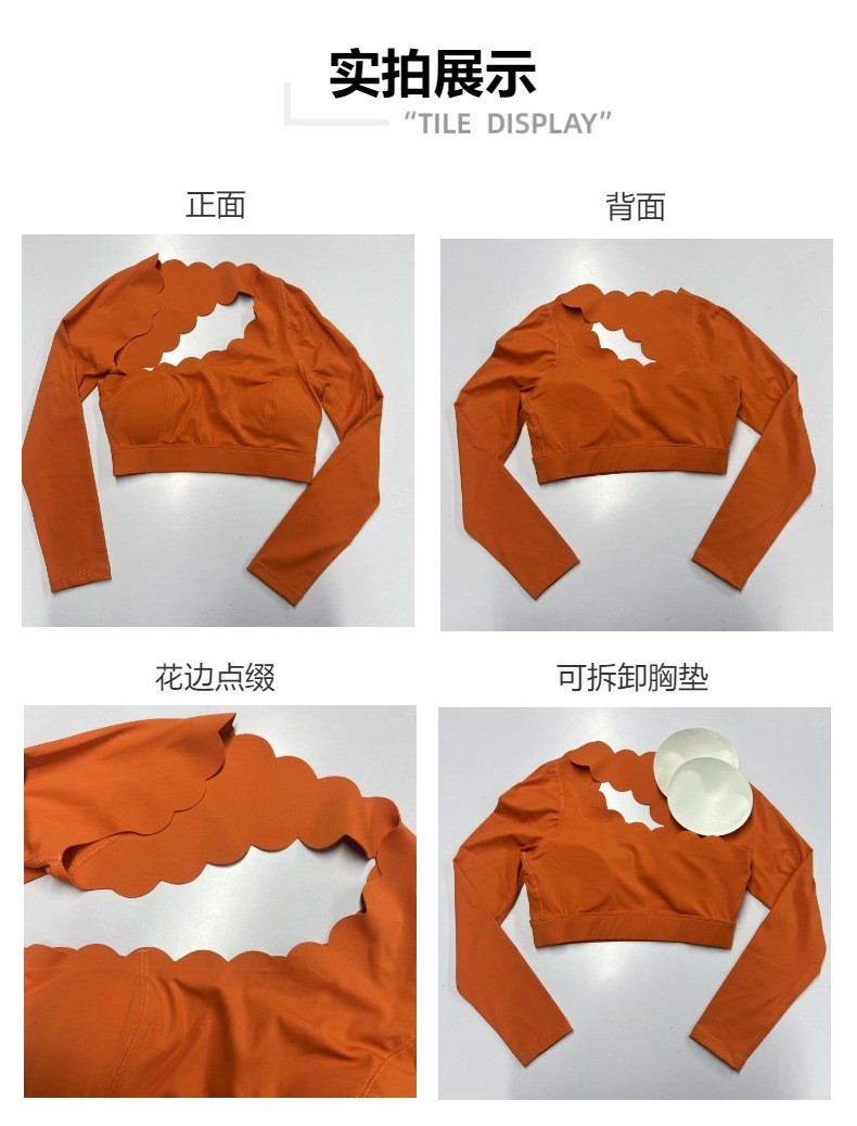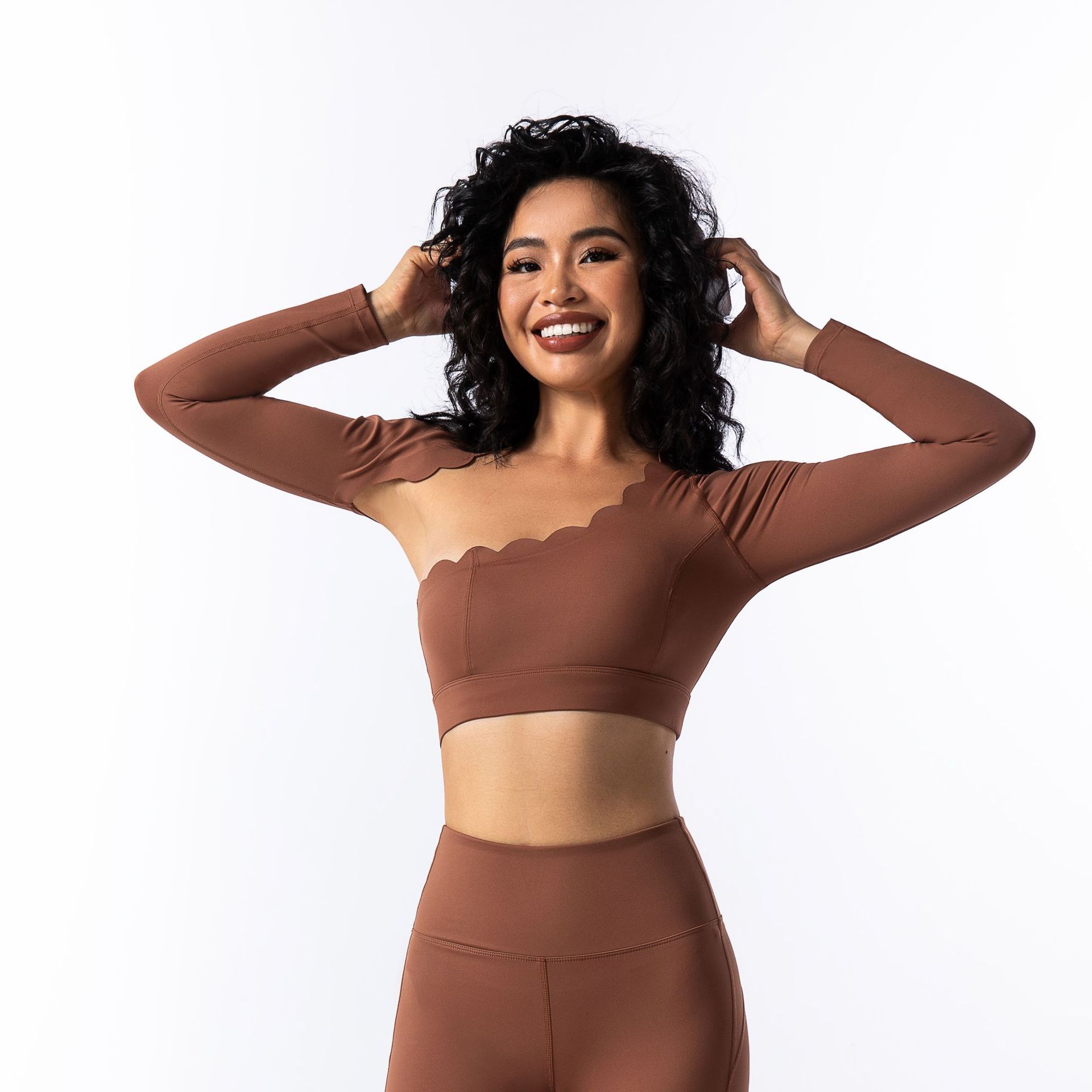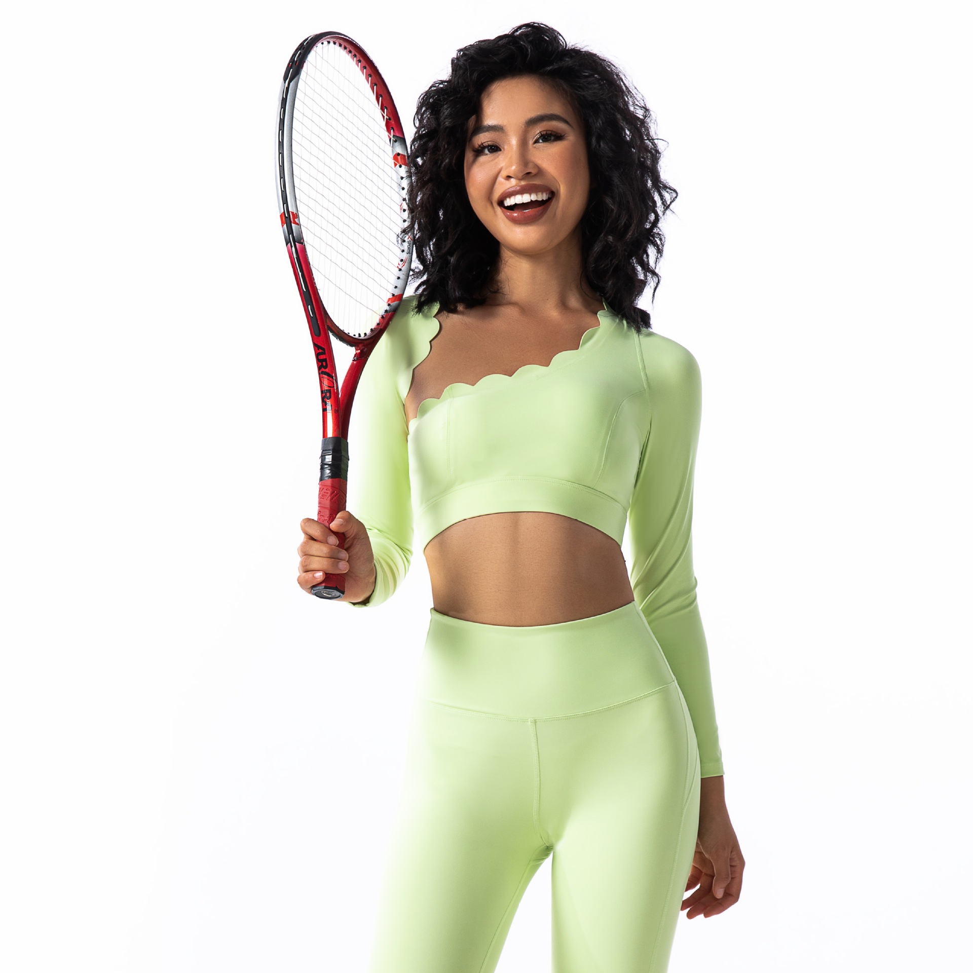 달리기 피트니스 스포츠 요가 세트 디자인 크로스 오버 어깨 상단 여성용 편안한 피부 친화적 인 통기성 충격 방지 긴 소매