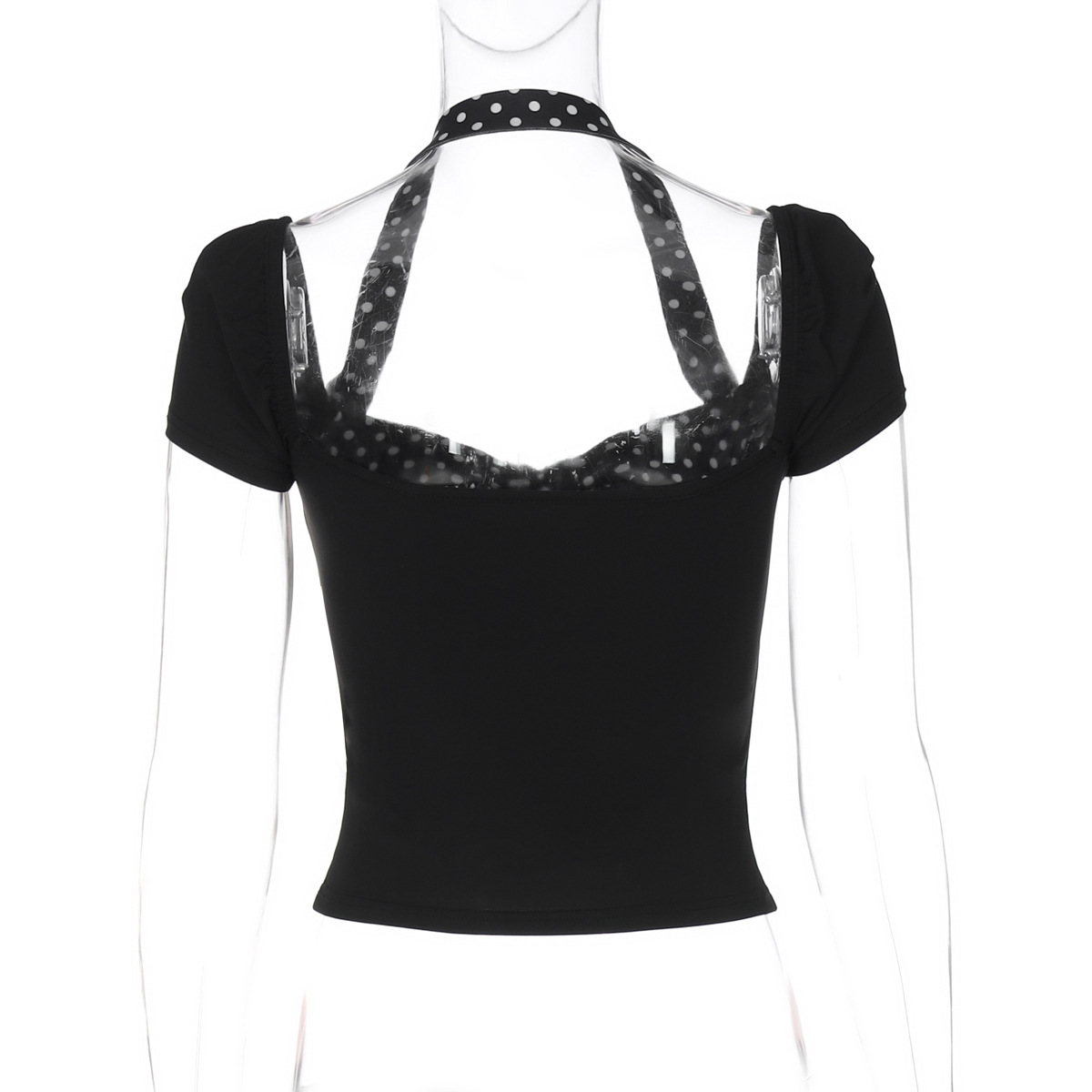 유럽과 미국의 뜨거운 여성의 2025 년 봄과 여름 새로운 교수형 목 짧은 소매 백리스 탑 웨이브 포인트 스티칭 티셔츠 탑 도매스토어 가기