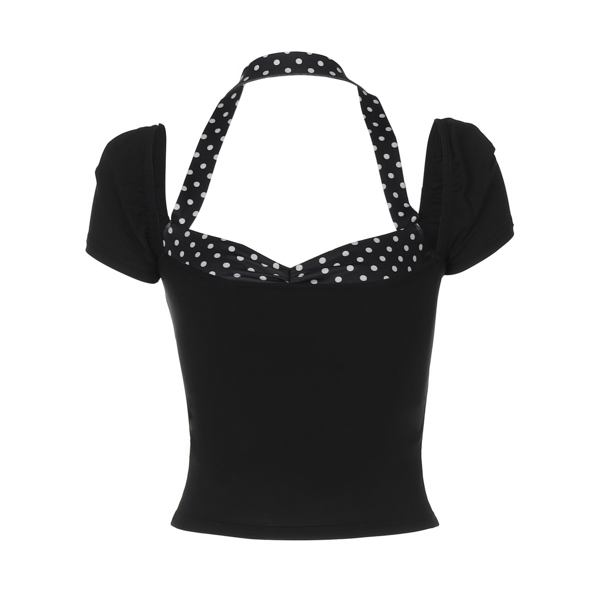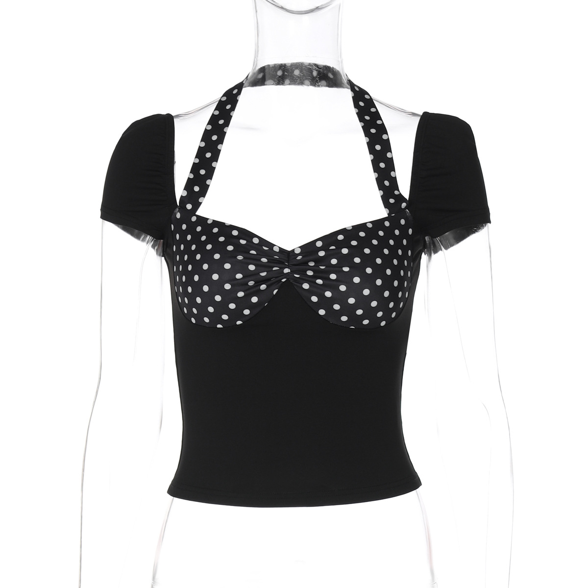 유럽과 미국의 뜨거운 여성의 2025 년 봄과 여름 새로운 교수형 목 짧은 소매 백리스 탑 웨이브 포인트 스티칭 티셔츠 탑 도매