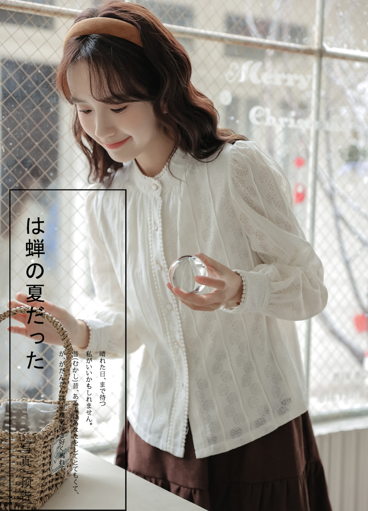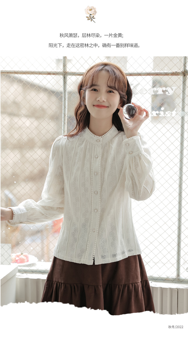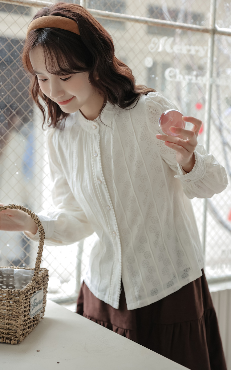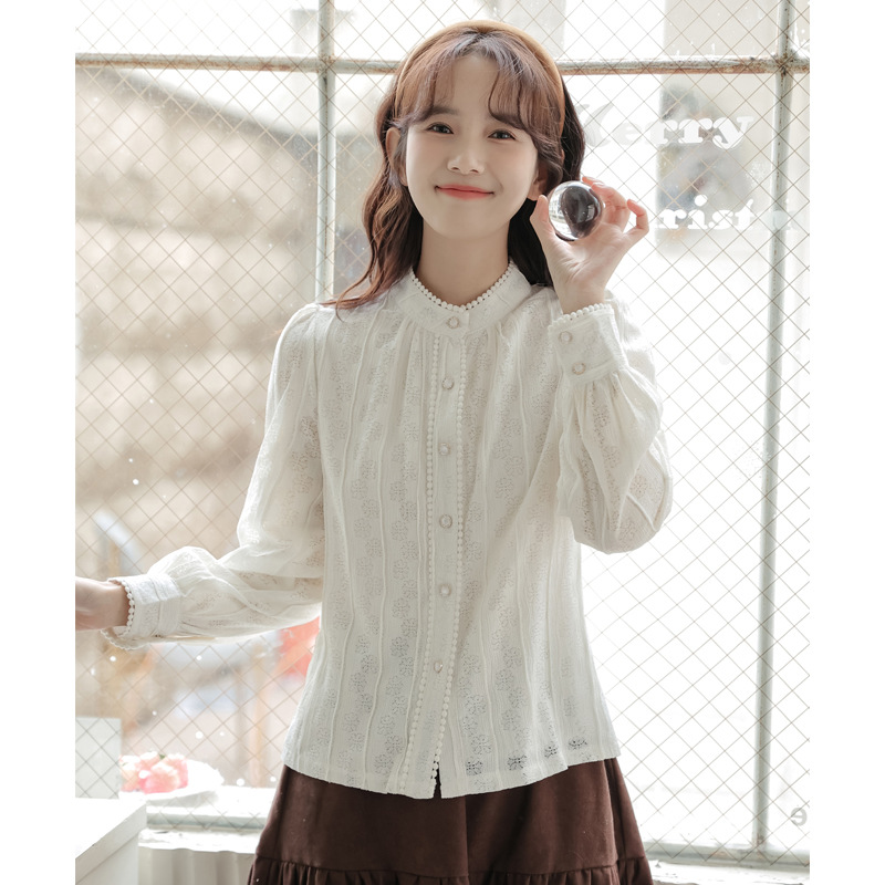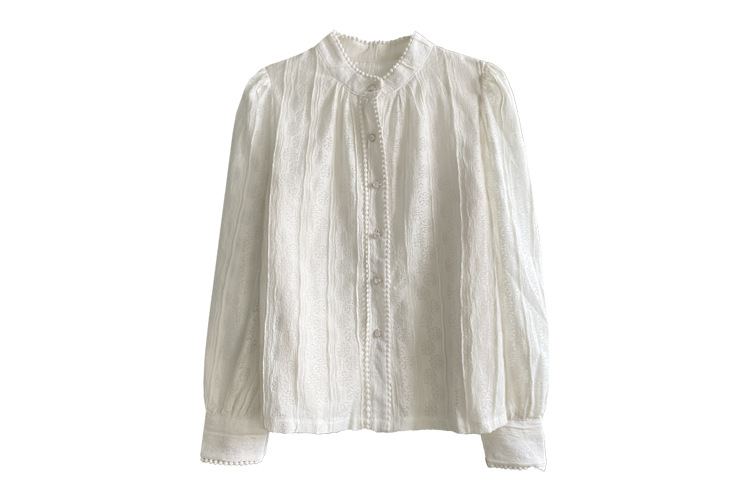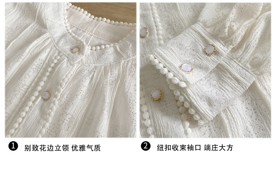 2025 봄 새로운 프랑스 부드러운 기질 스탠드 칼라 레이스 크로 셰 뜨개질 자수 긴 소매 아름다운 레이스 셔츠