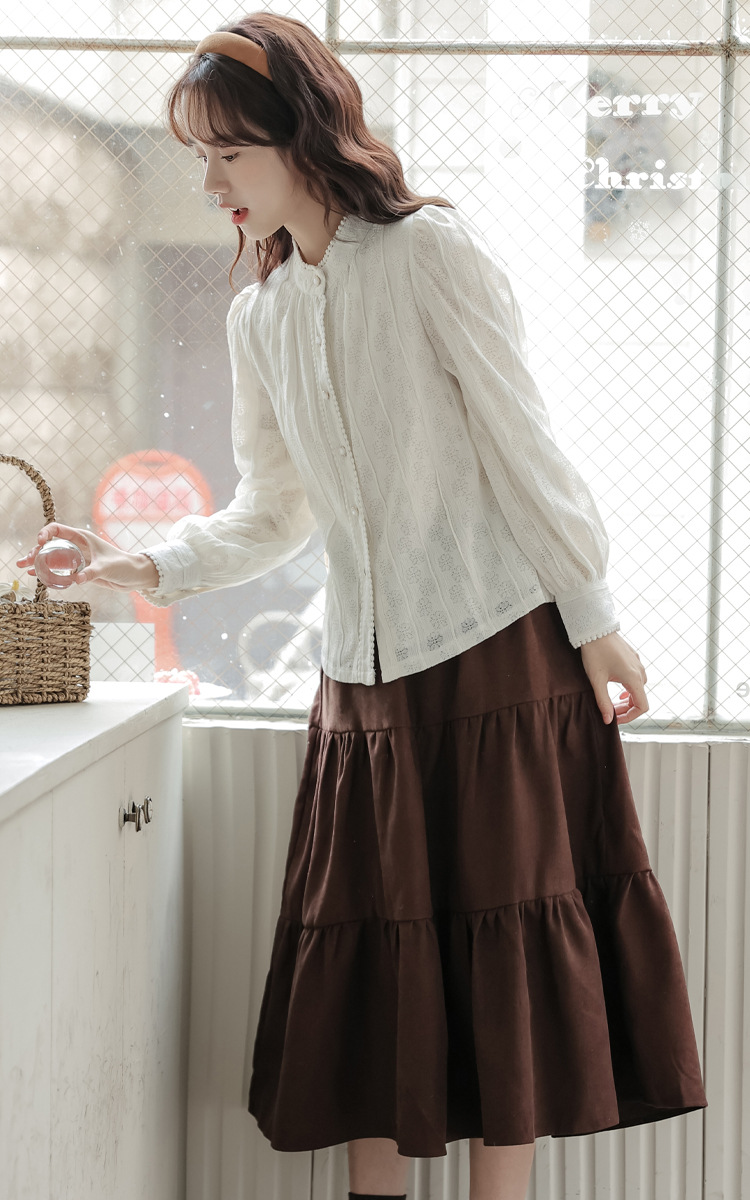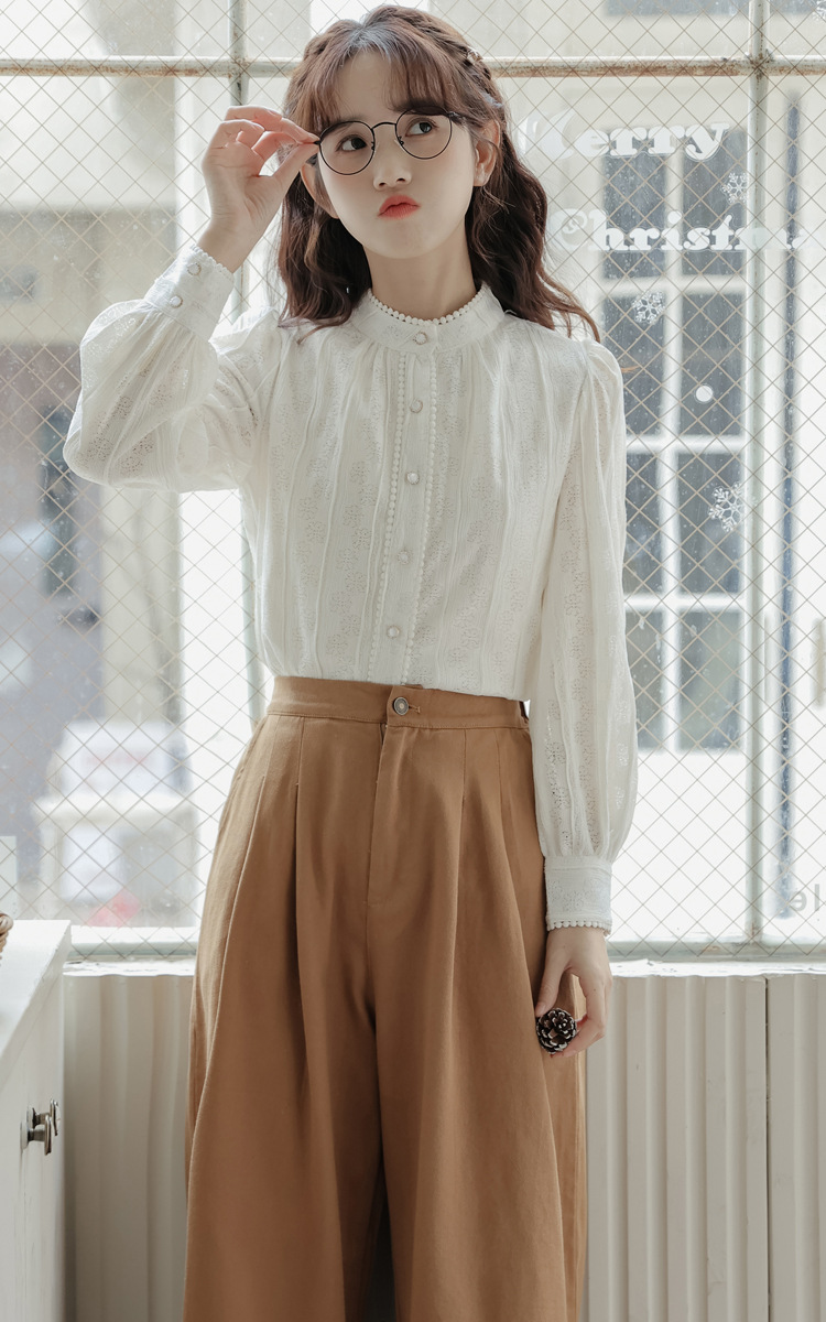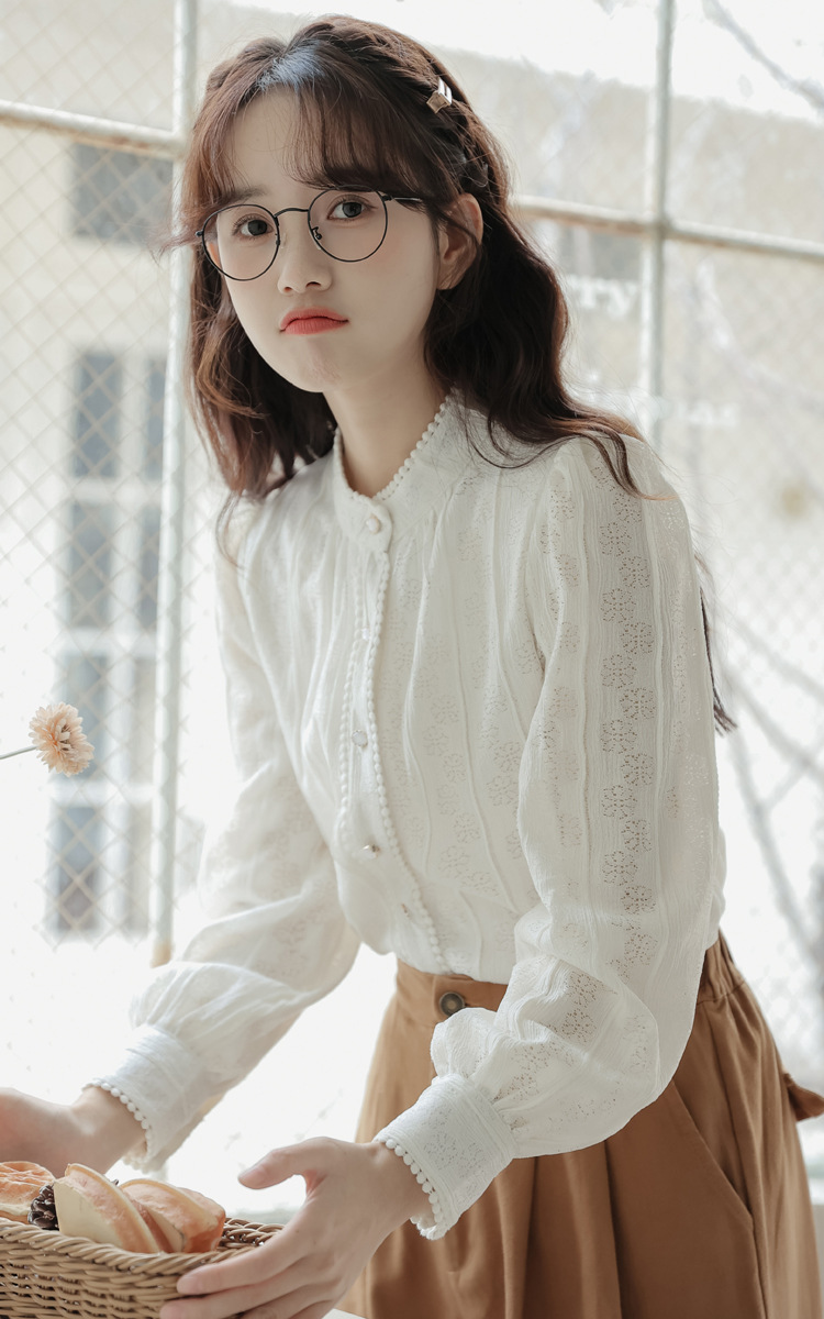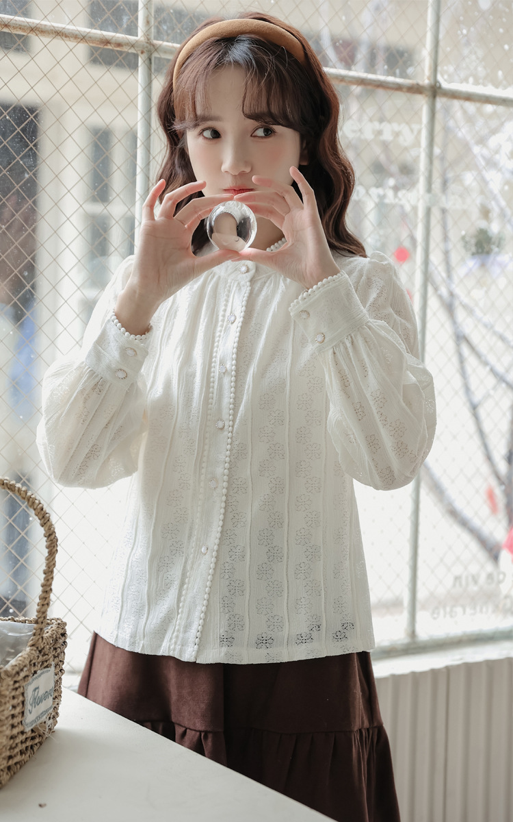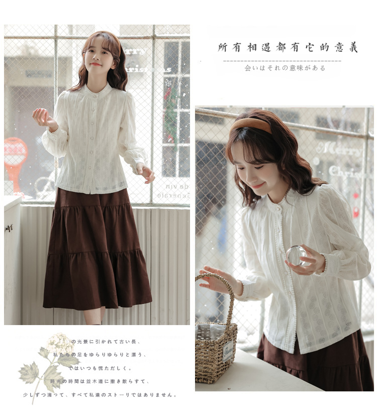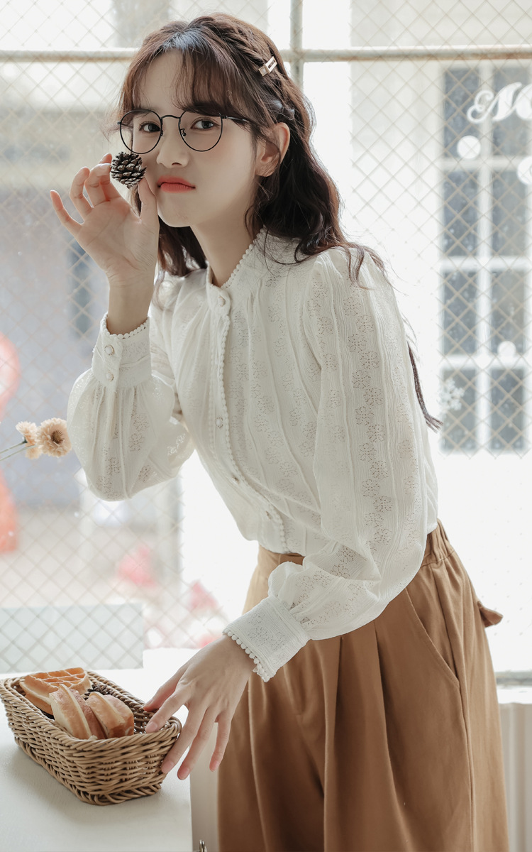 2025 봄 새로운 프랑스 부드러운 기질 스탠드 칼라 레이스 크로 셰 뜨개질 자수 긴 소매 아름다운 레이스 셔츠