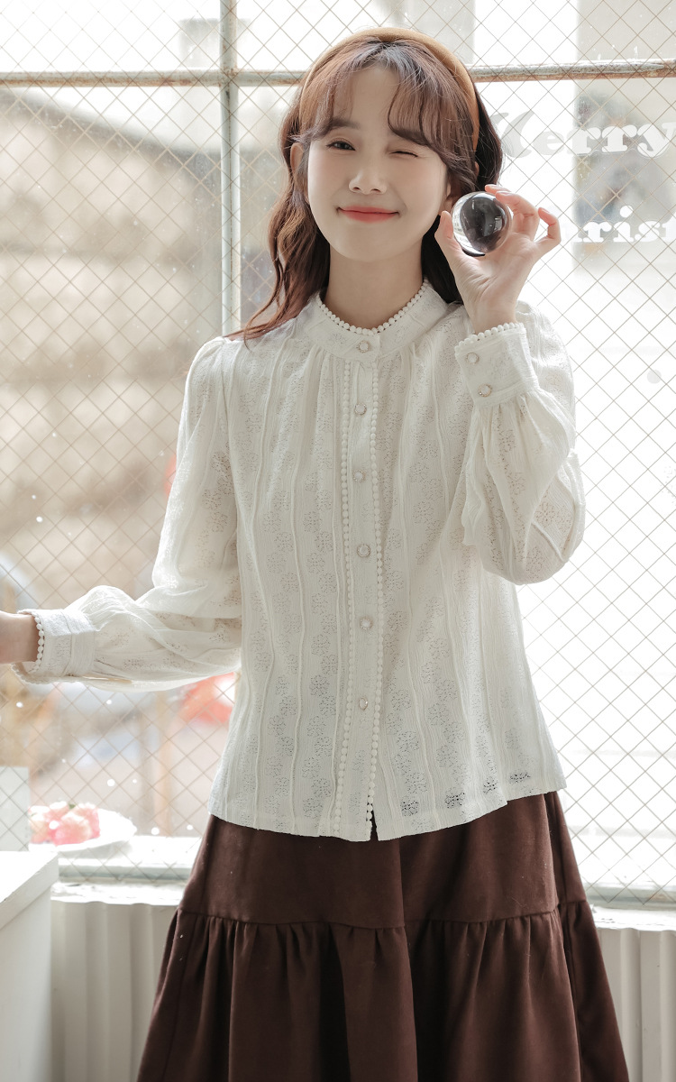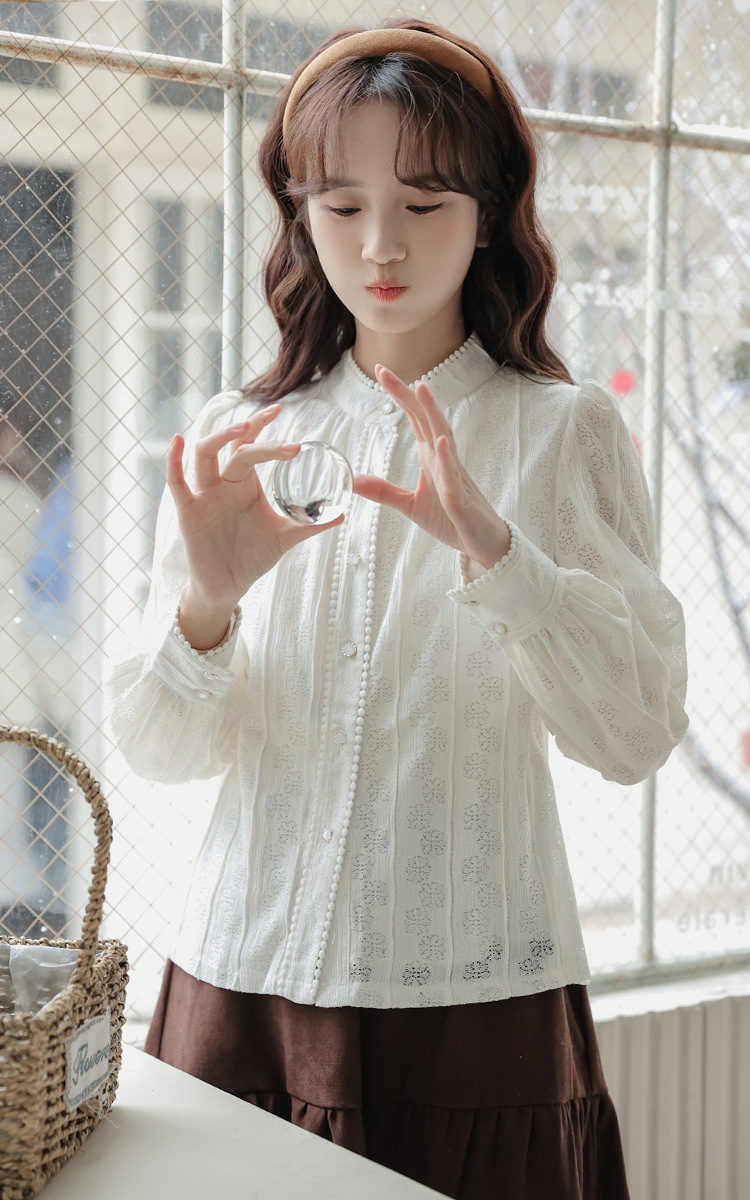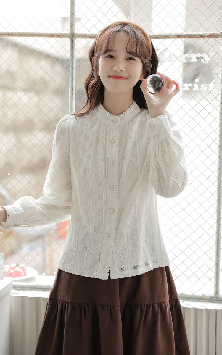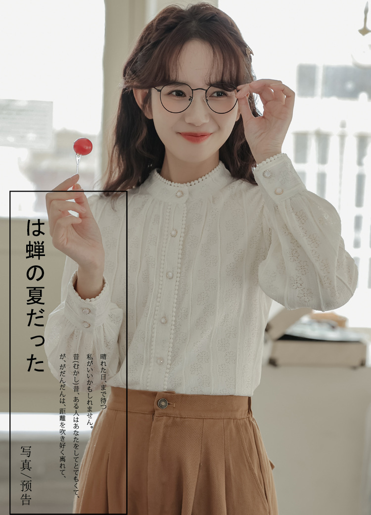 2025 봄 새로운 프랑스 부드러운 기질 스탠드 칼라 레이스 크로 셰 뜨개질 자수 긴 소매 아름다운 레이스 셔츠스토어 가기