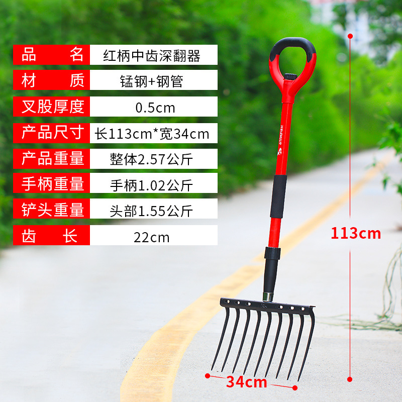 • 빨간색 손잡이와 긴 이빨이 있는 깊은 경운기(면 장갑 포함)