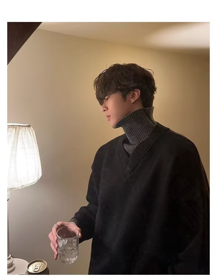 겨울 새 가짜 투피스 스티칭 터틀넥 스웨터 톱 남자 한국 스타일 유행 캐주얼 올 매치 스웨터스토어 가기