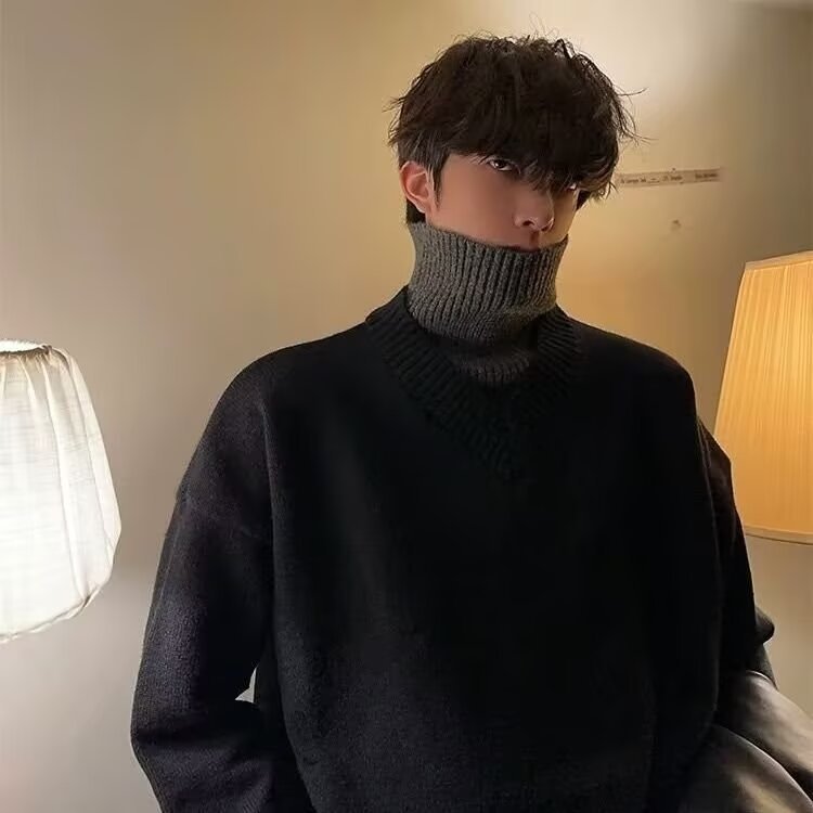 겨울 새 가짜 투피스 스티칭 터틀넥 스웨터 톱 남자 한국 스타일 유행 캐주얼 올 매치 스웨터