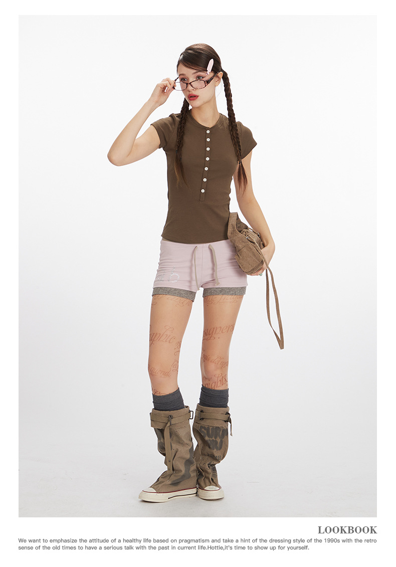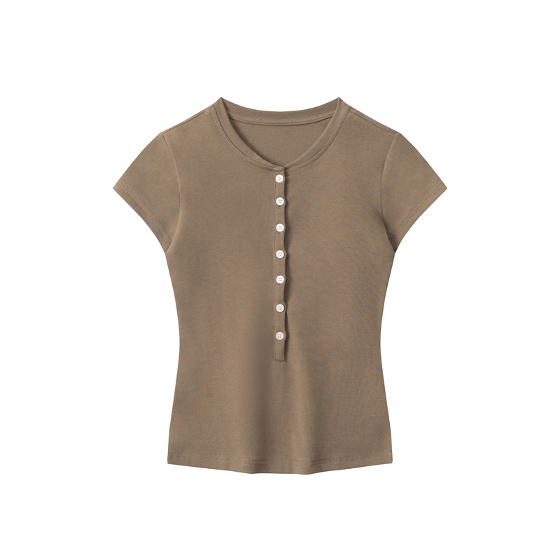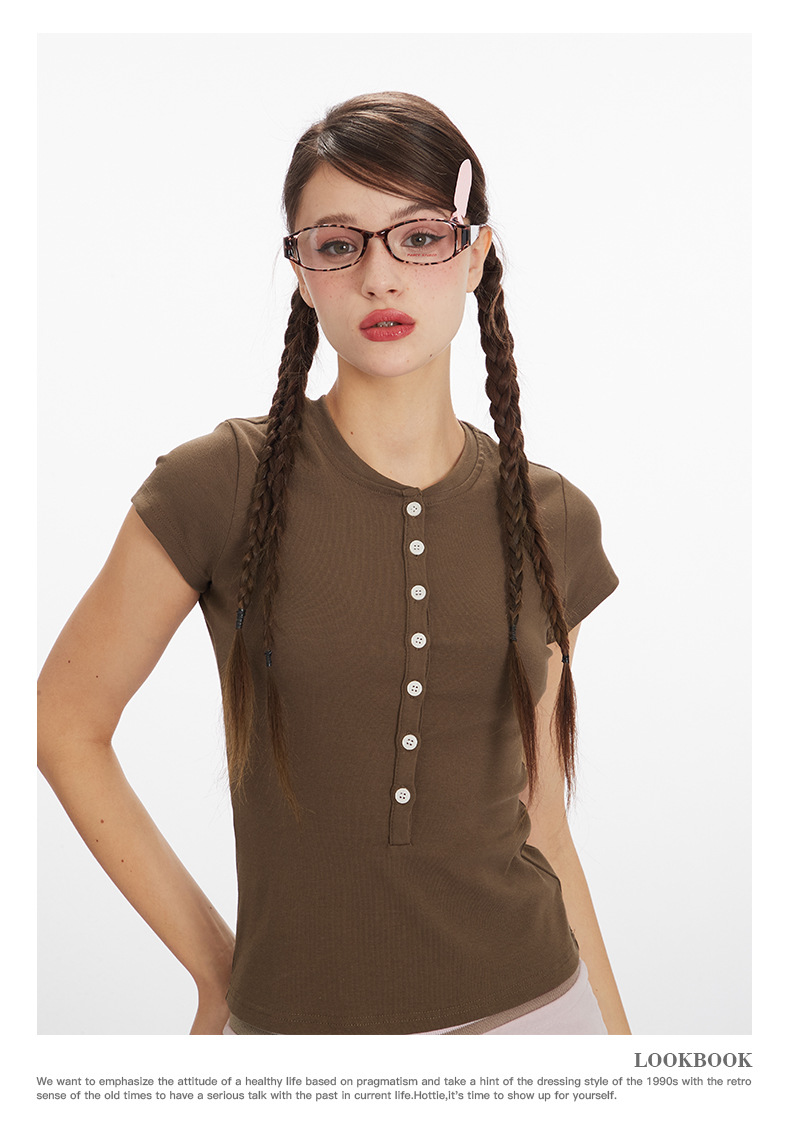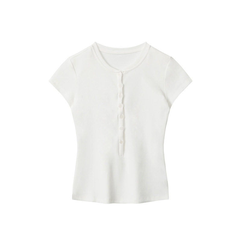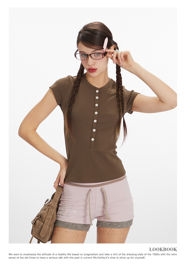 HeyHenry 2025 아메리칸 스타일 스파이스 걸스 하프 오픈 넥 슬림 반팔 티셔츠 여성용 여름 쇼트 탑 INS스토어 가기