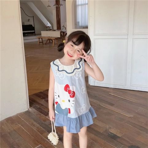 어린이 아기 소녀 2025 여름 새로운 만화 인쇄 통기성 민소매 옷깃 Vic 원피스 귀여운 케이티스토어 가기
