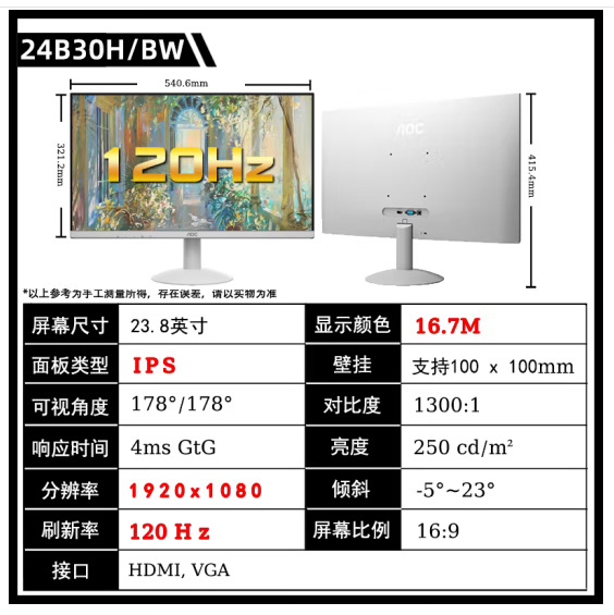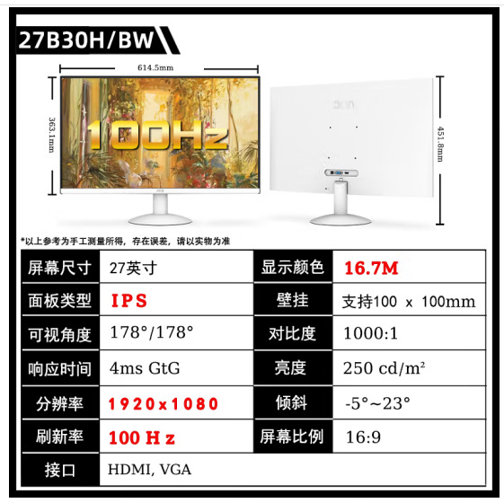 AOC 27B30H/BW 27 인치 흰색 IPS 낮은 푸른 빛 100hz 컴퓨터 홈 오피스 LCD 모니터