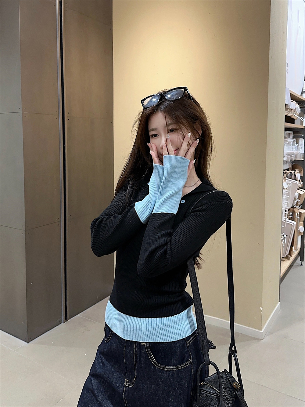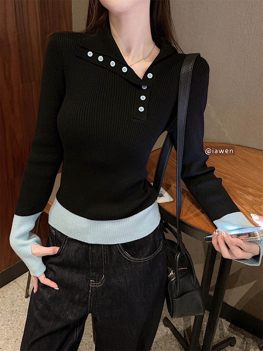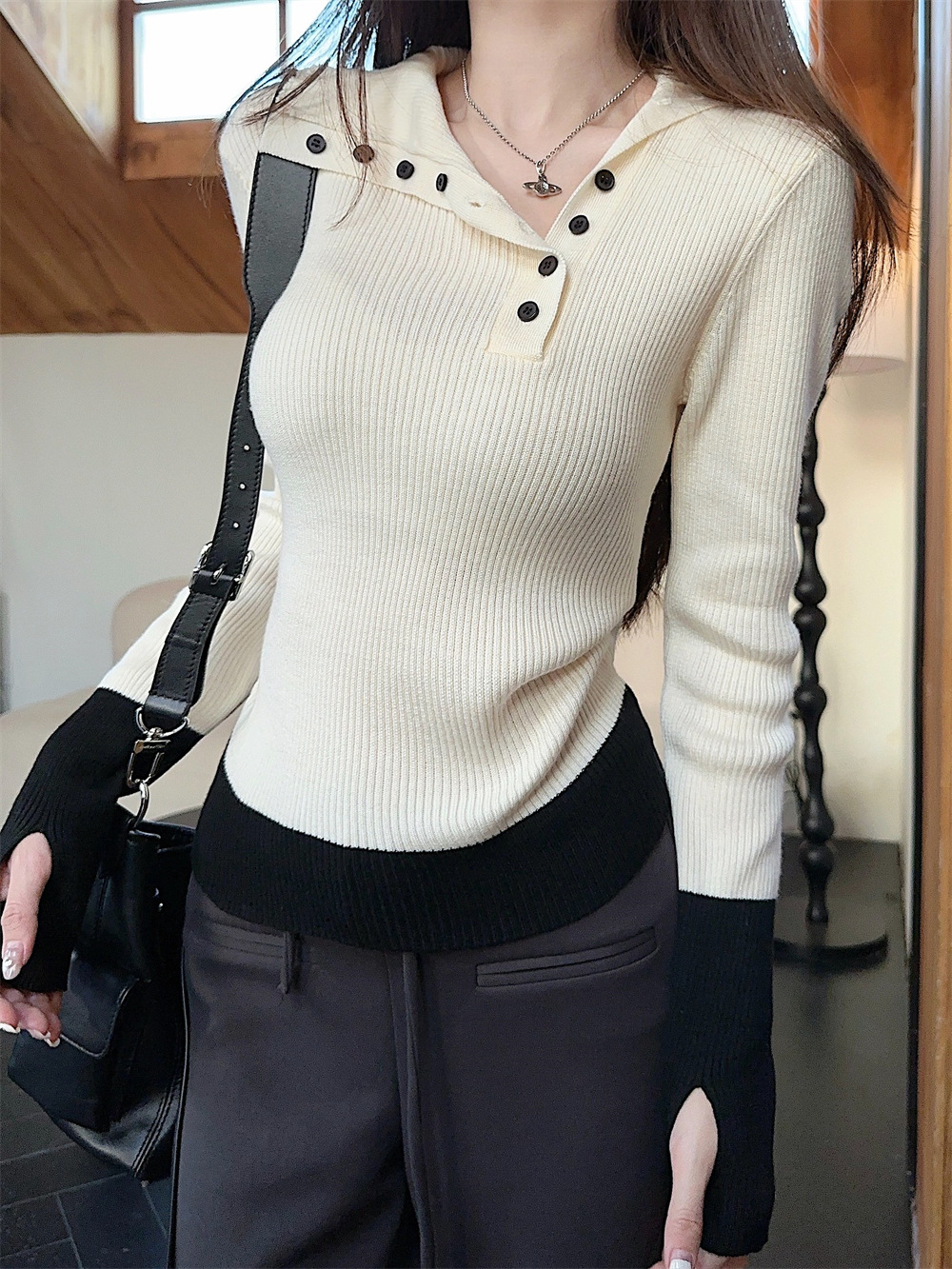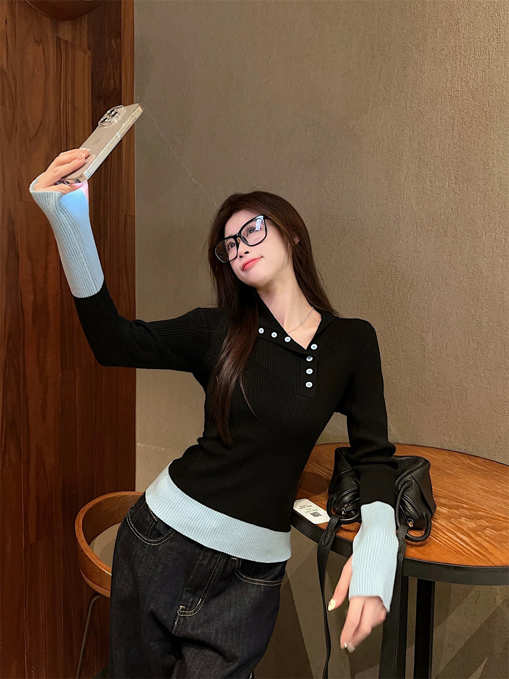 스티칭 콘트라스트 컬러 디자인 옷깃베이스 스웨터 여성의 가을과 겨울 슬림핏 슬리밍 기질 두꺼운 내부 스웨터