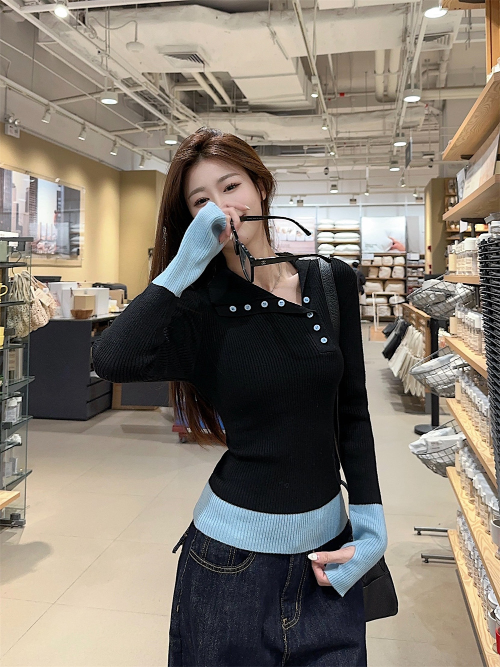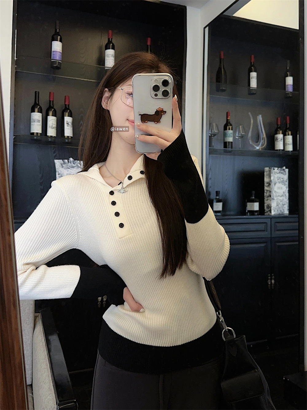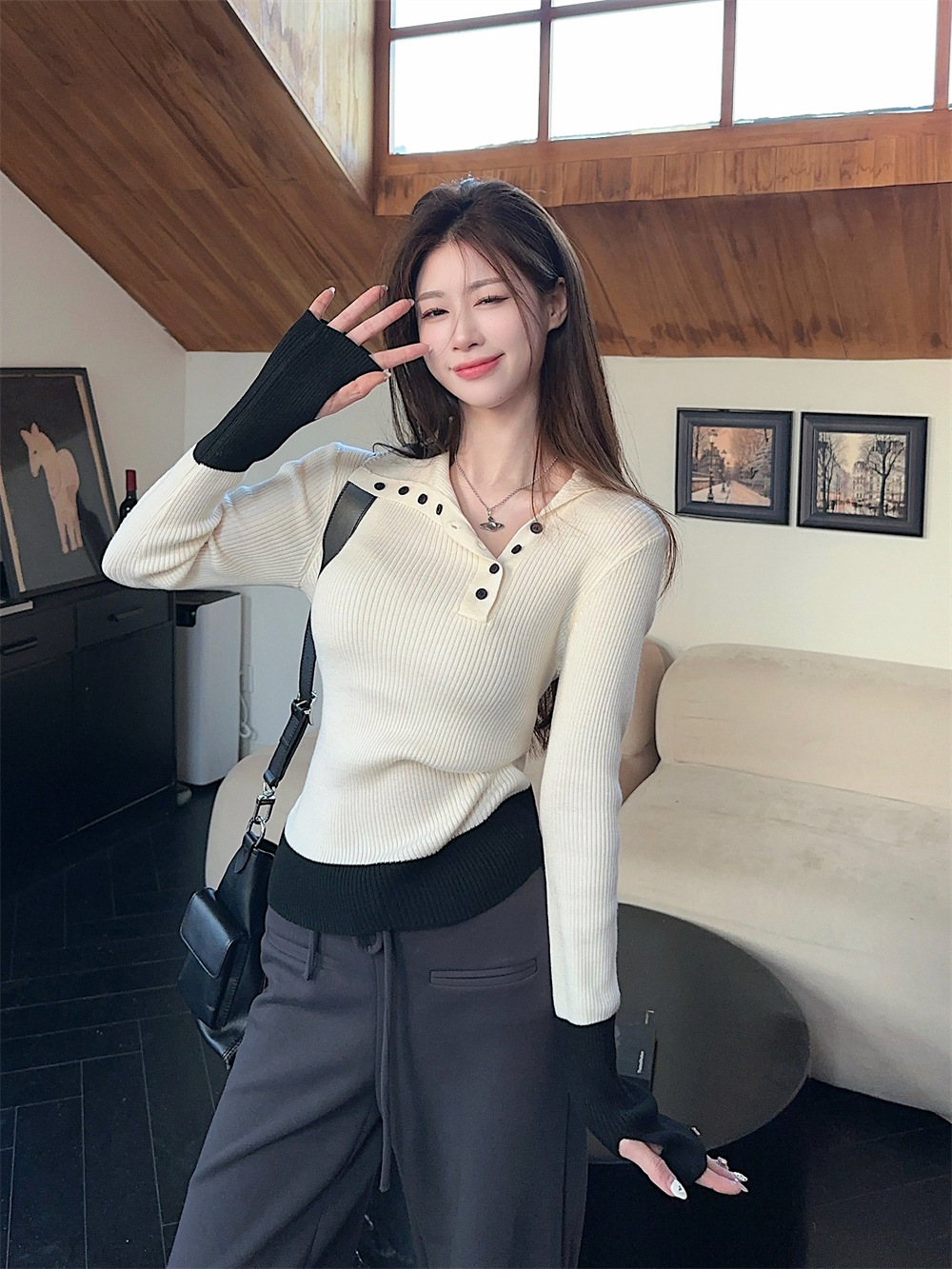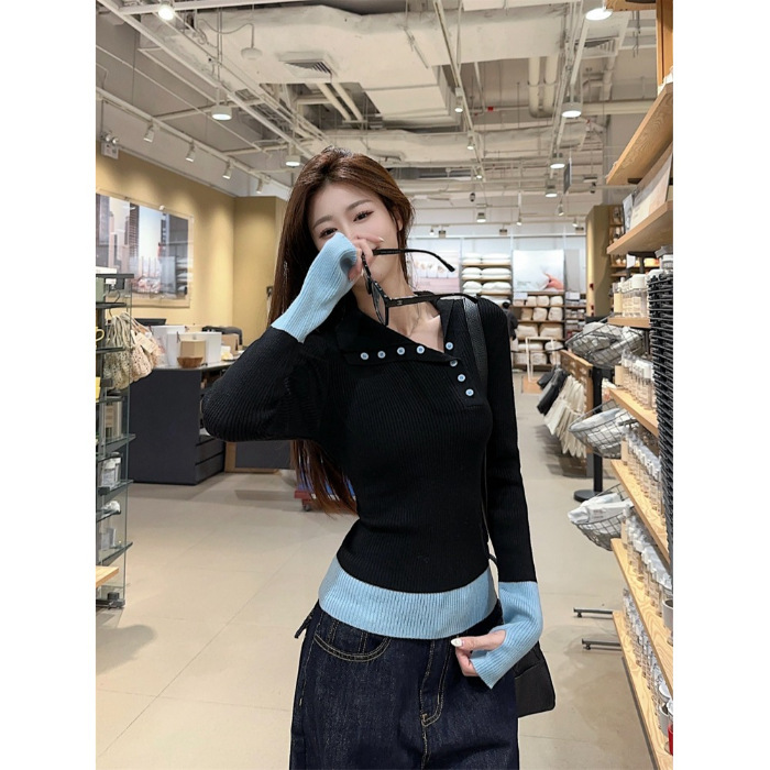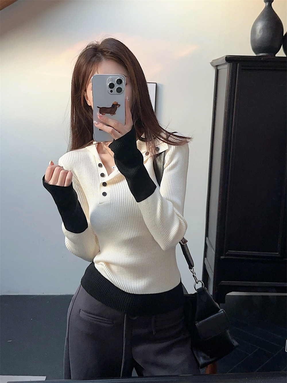 스티칭 콘트라스트 컬러 디자인 옷깃베이스 스웨터 여성의 가을과 겨울 슬림핏 슬리밍 기질 두꺼운 내부 스웨터