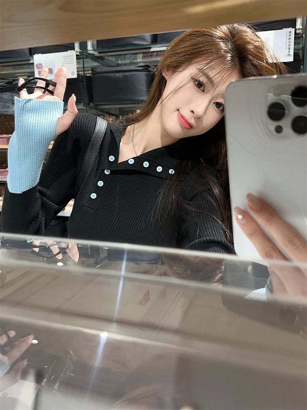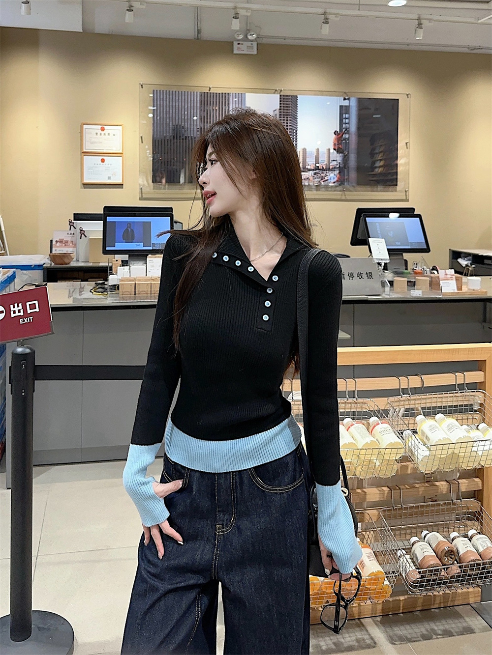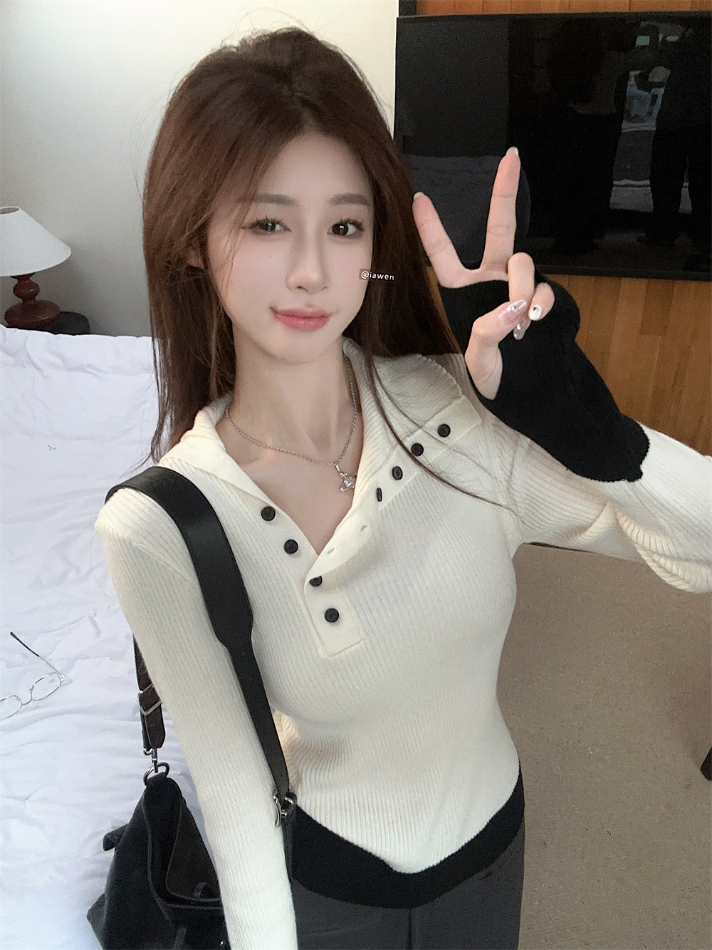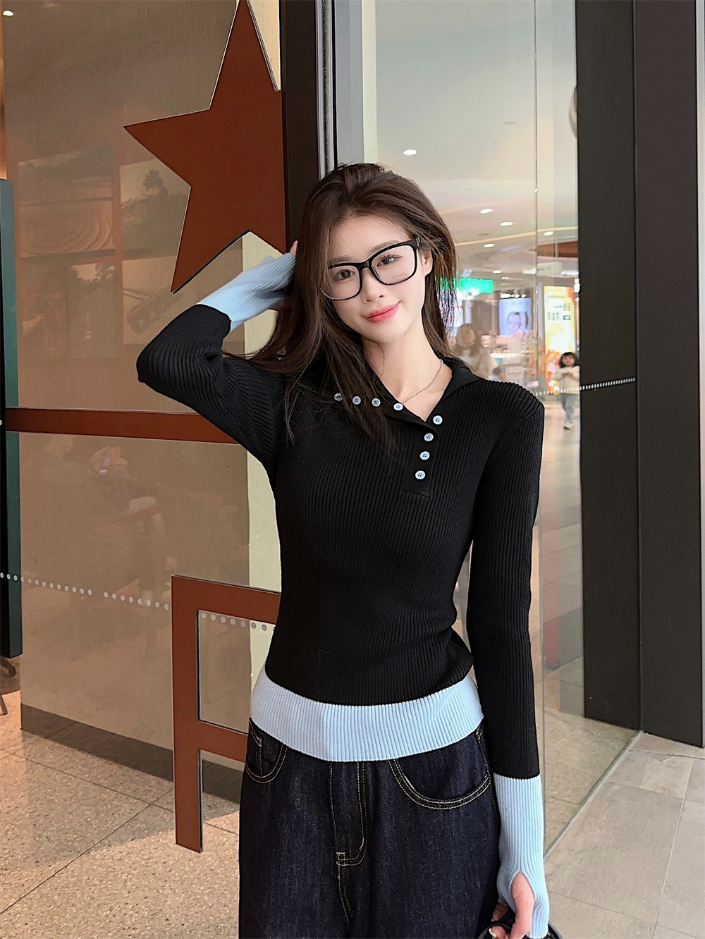 스티칭 콘트라스트 컬러 디자인 옷깃베이스 스웨터 여성의 가을과 겨울 슬림핏 슬리밍 기질 두꺼운 내부 스웨터