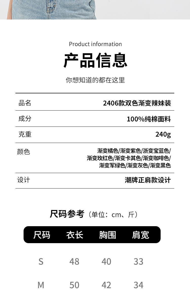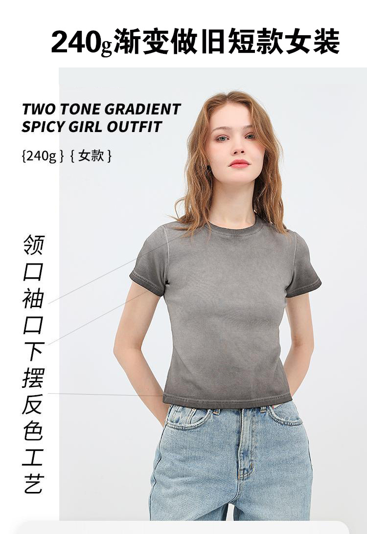 240g 레트로 여성용 투톤 그라데이션 순면 티셔츠 배꼽 노출 슬림핏 섹시한 라운드넥 반팔 여성 티셔츠
