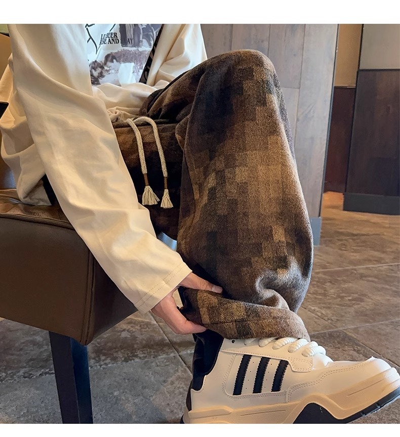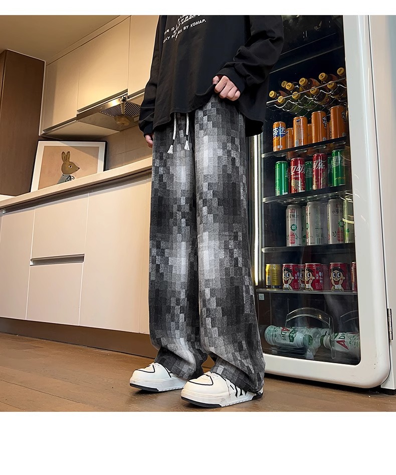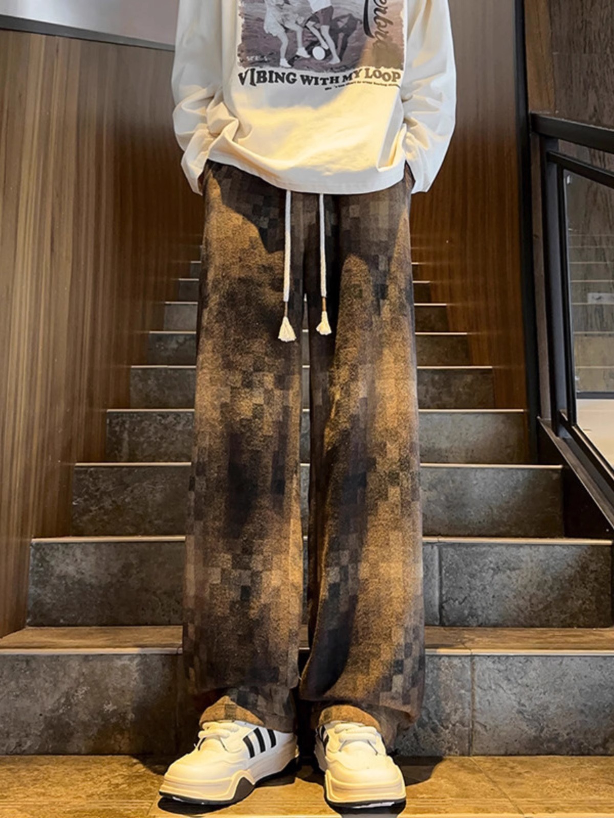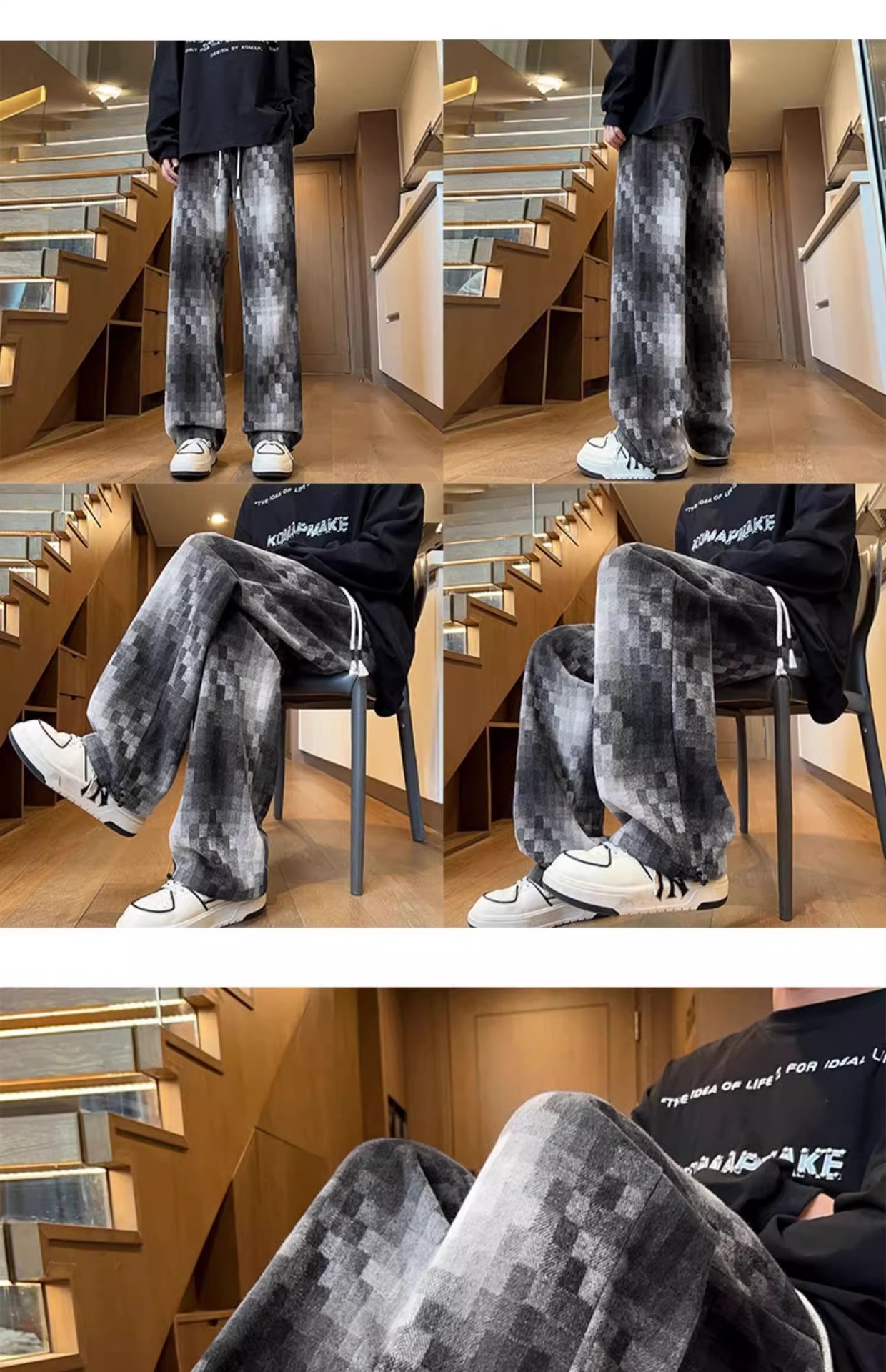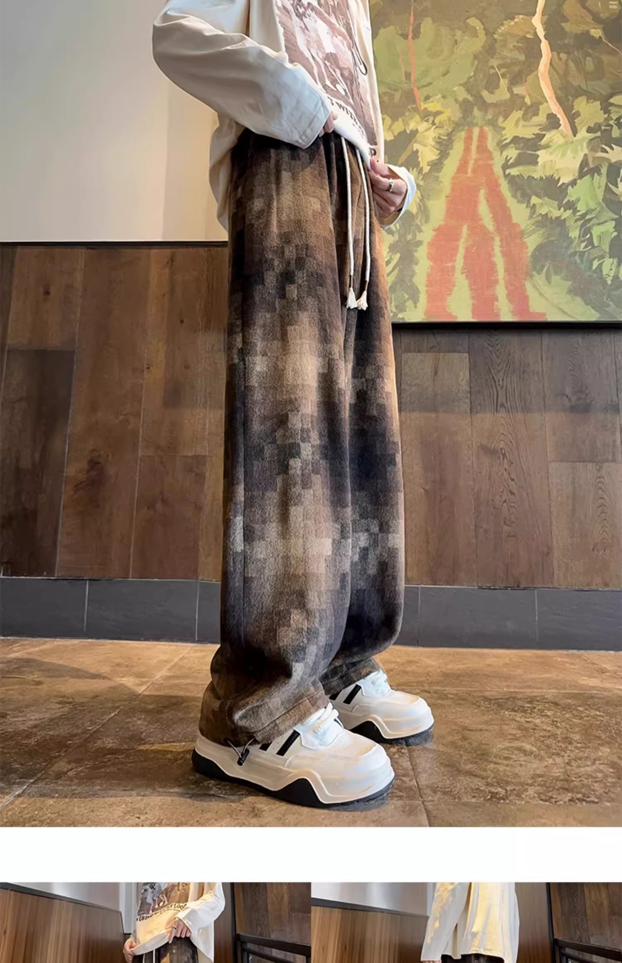 플러스 사이즈 미국 레트로 픽셀 격자 무늬 바지 남성 가을 겨울 패션 브랜드 하이 스트리트 틈새 디자인 느슨한 캐주얼 바지