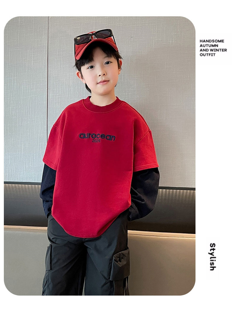 소년의 봄 티셔츠 2025 새로운 도착 CUHK 어린이 봄과 가을 서양 스타일 가짜 투피스 스웨트 셔츠 바느질 긴팔 트렌디 티셔츠스토어 가기