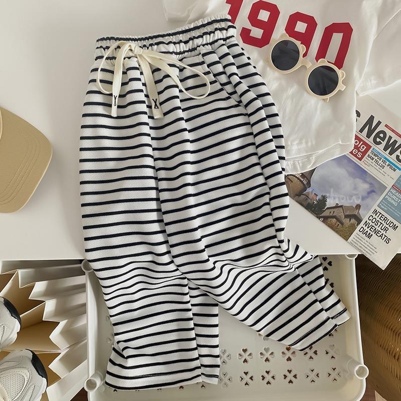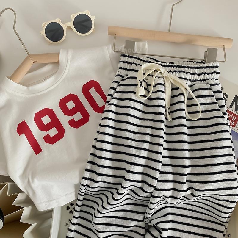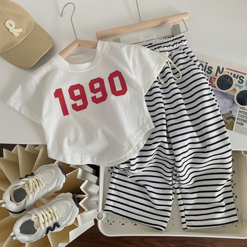여자 한국식 세트 2025 여름 소녀 미국식 반팔 줄무늬 티셔츠 와이드 레그 바지 캐주얼 인터넷 트렌디 T