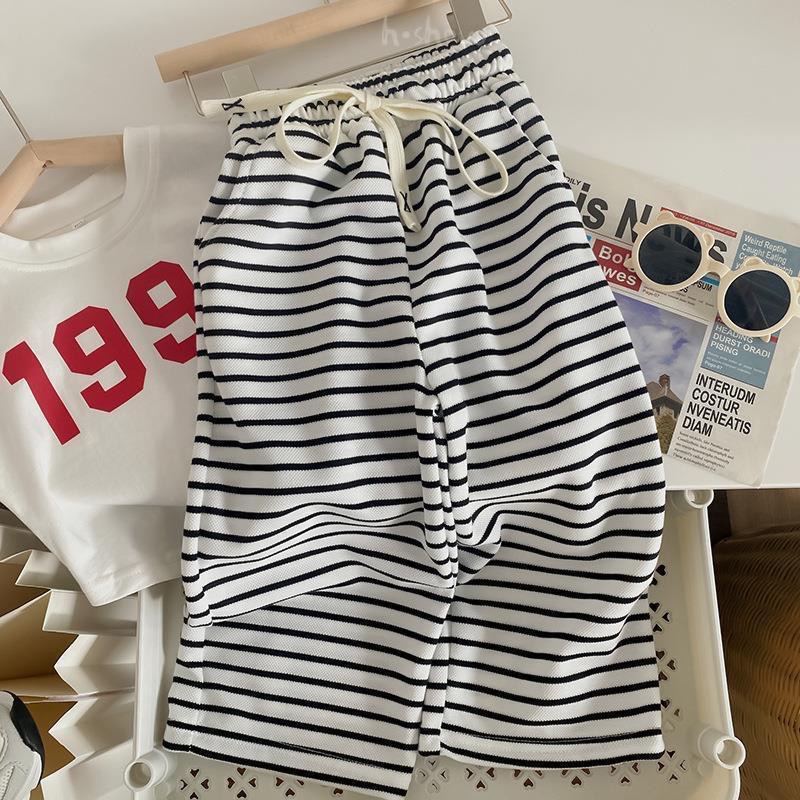 여자 한국식 세트 2025 여름 소녀 미국식 반팔 줄무늬 티셔츠 와이드 레그 바지 캐주얼 인터넷 트렌디 T스토어 가기