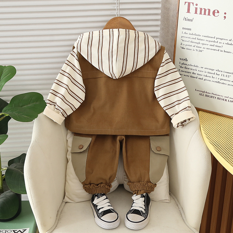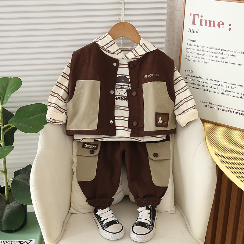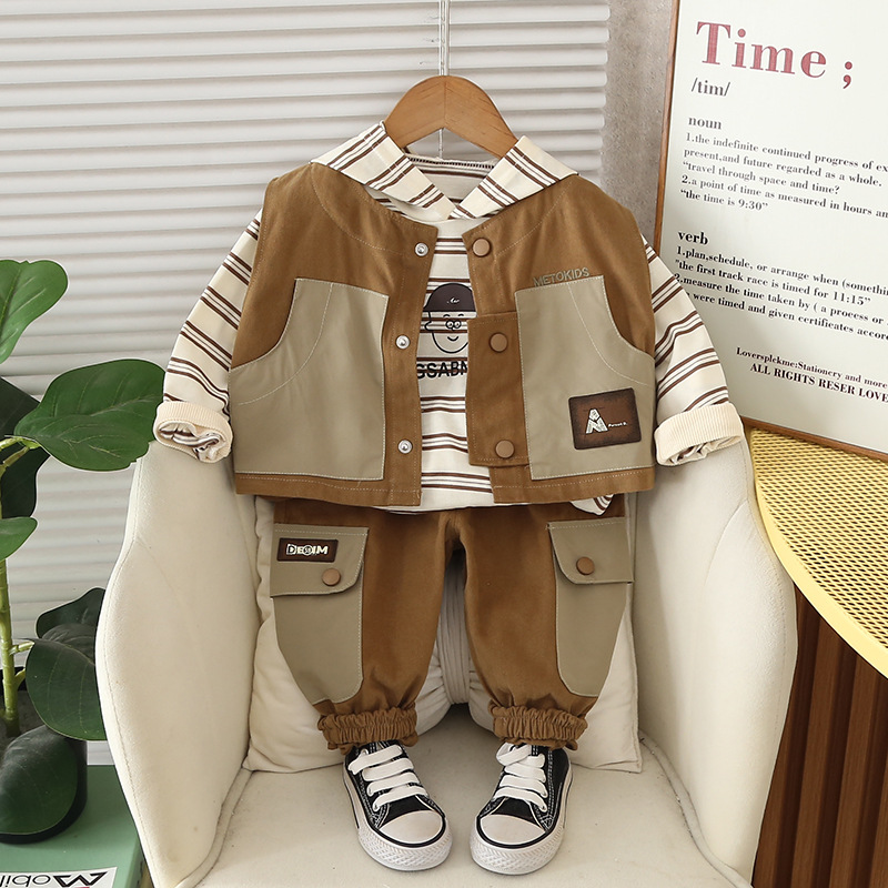 어린이 남성 세트 2025 봄 새 아기 조끼 3 피스 스트라이프 코트 바지는 머리카락 세대를 추세