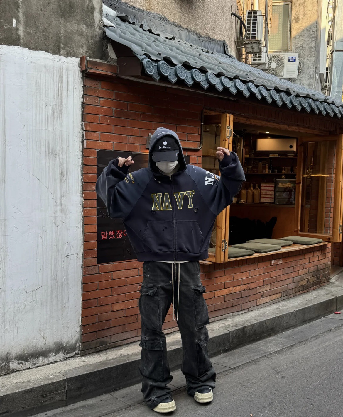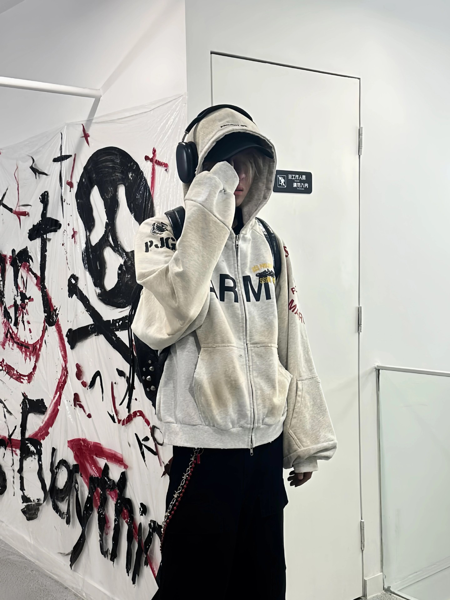 Jimo GRAILZ 유럽과 미국의 무거운 가짜 2 조각 바느질 중공업 순수 면화 세척 오래된 지퍼 후드 스웨트 재킷스토어 가기