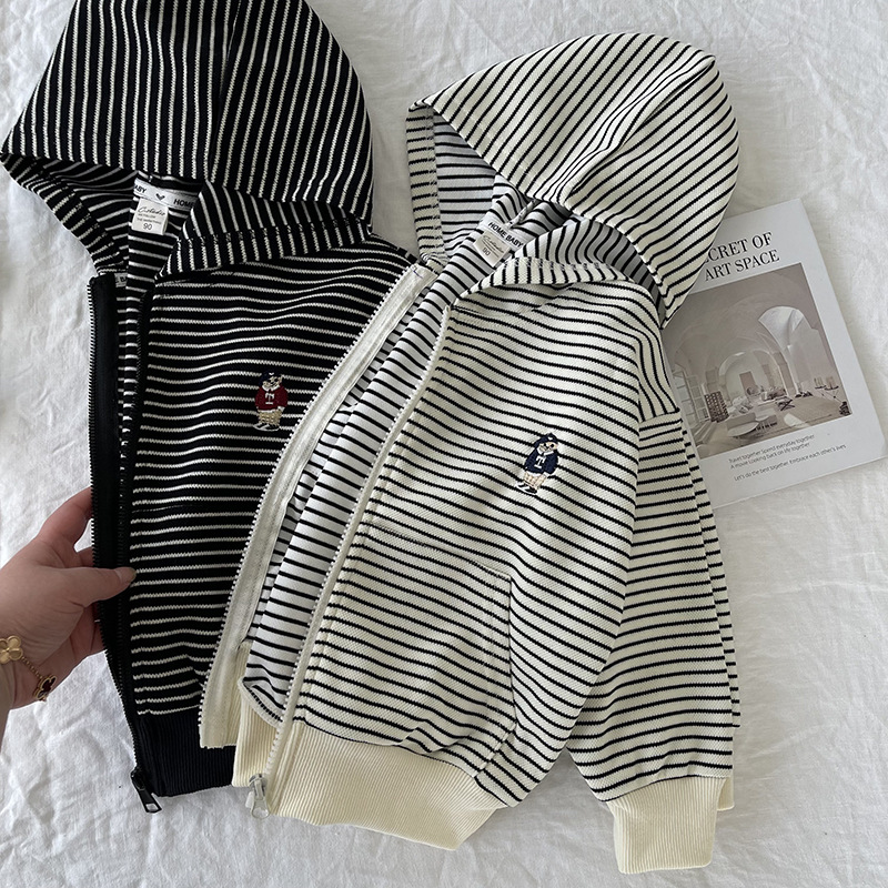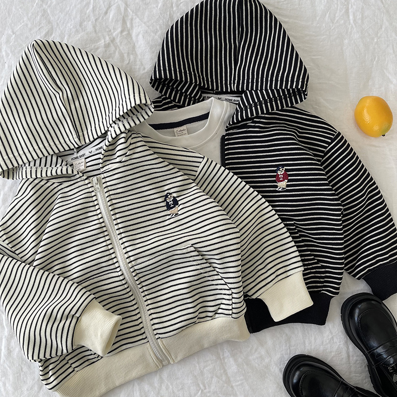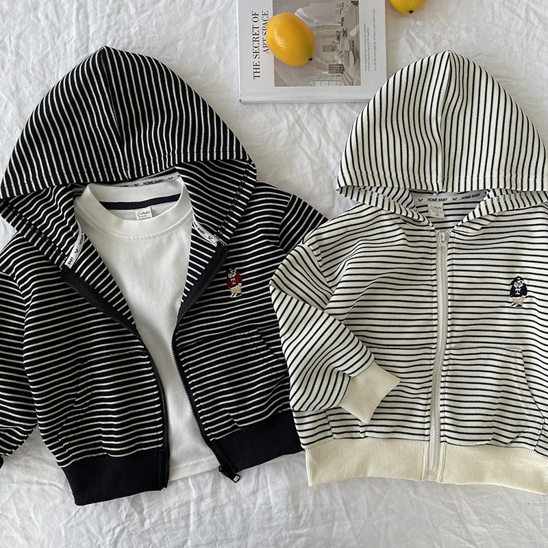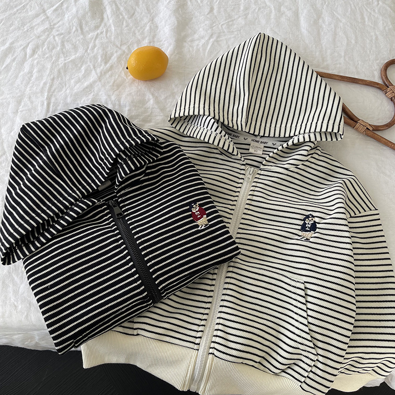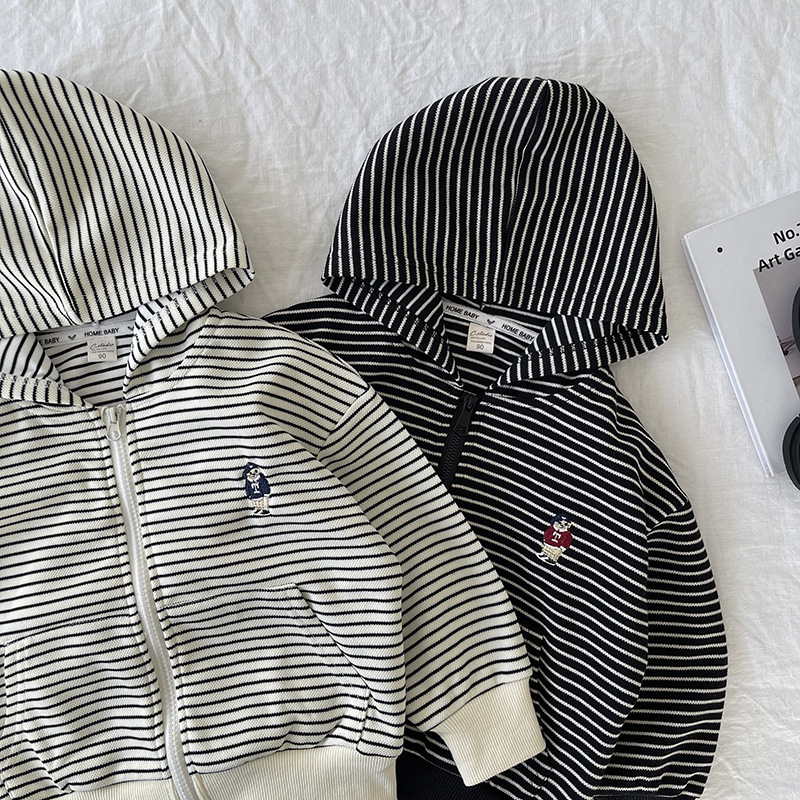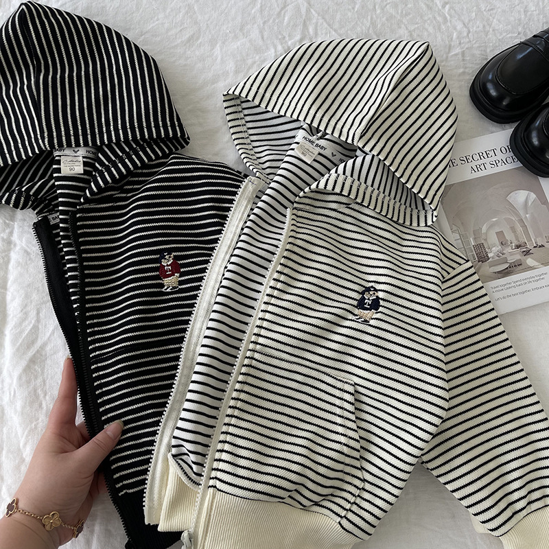[산악경] 어린이 코트 2025 봄새 소년 · 소녀 후드줄무늬 카디건 코트 곰 자수스토어 가기