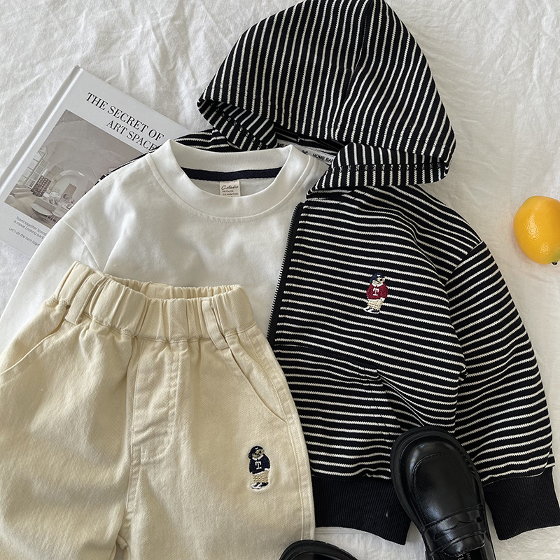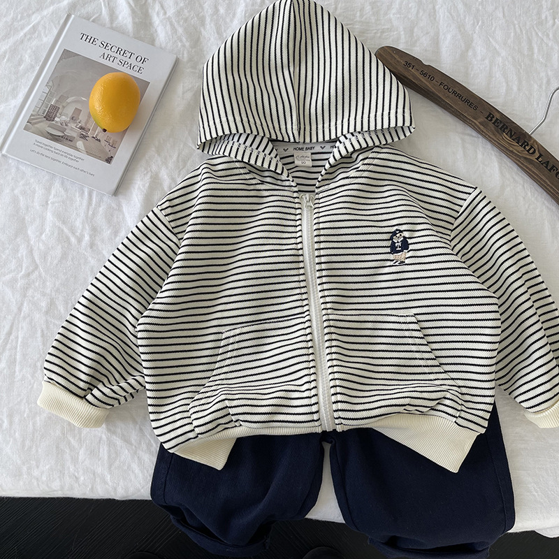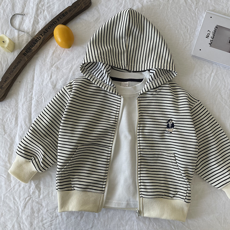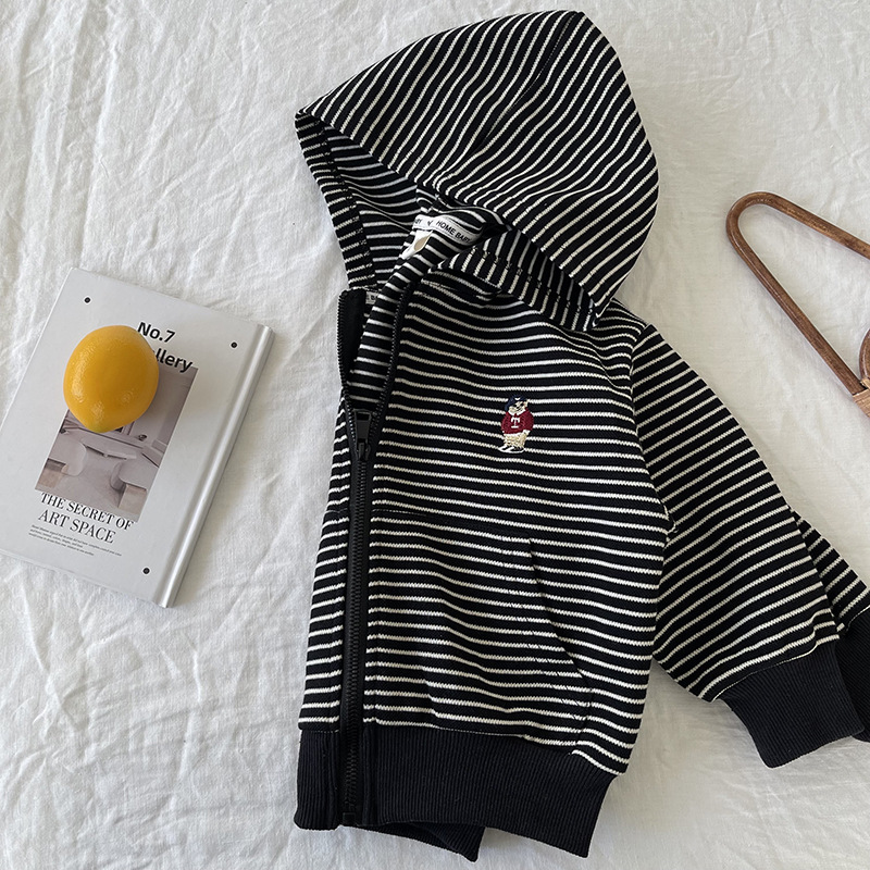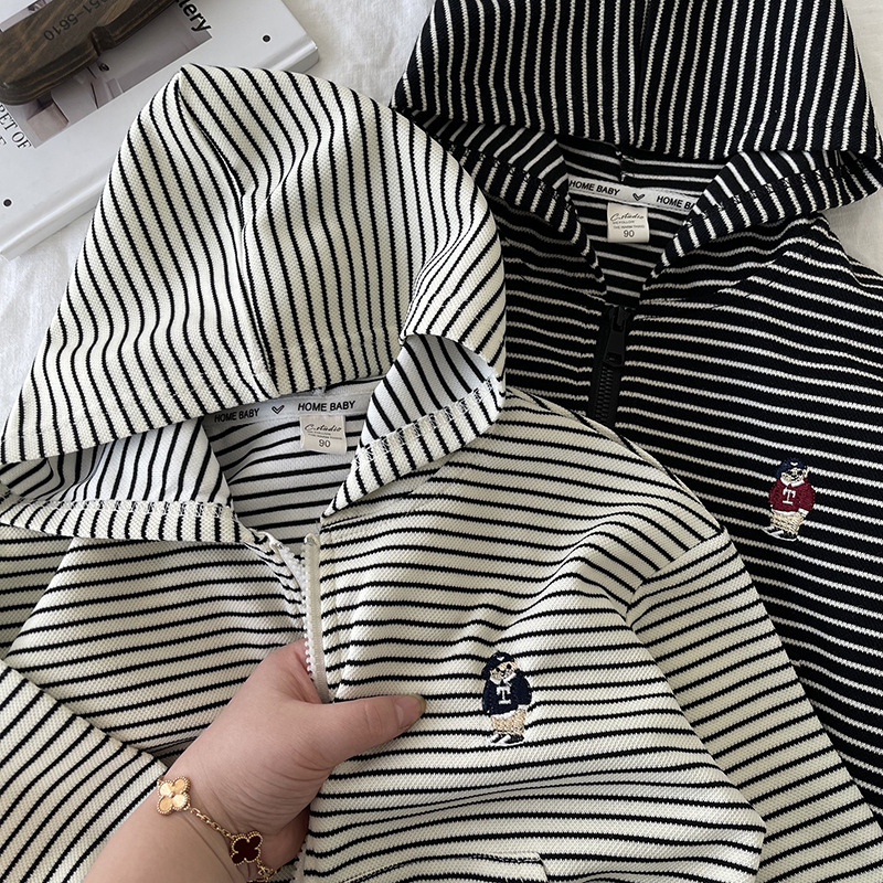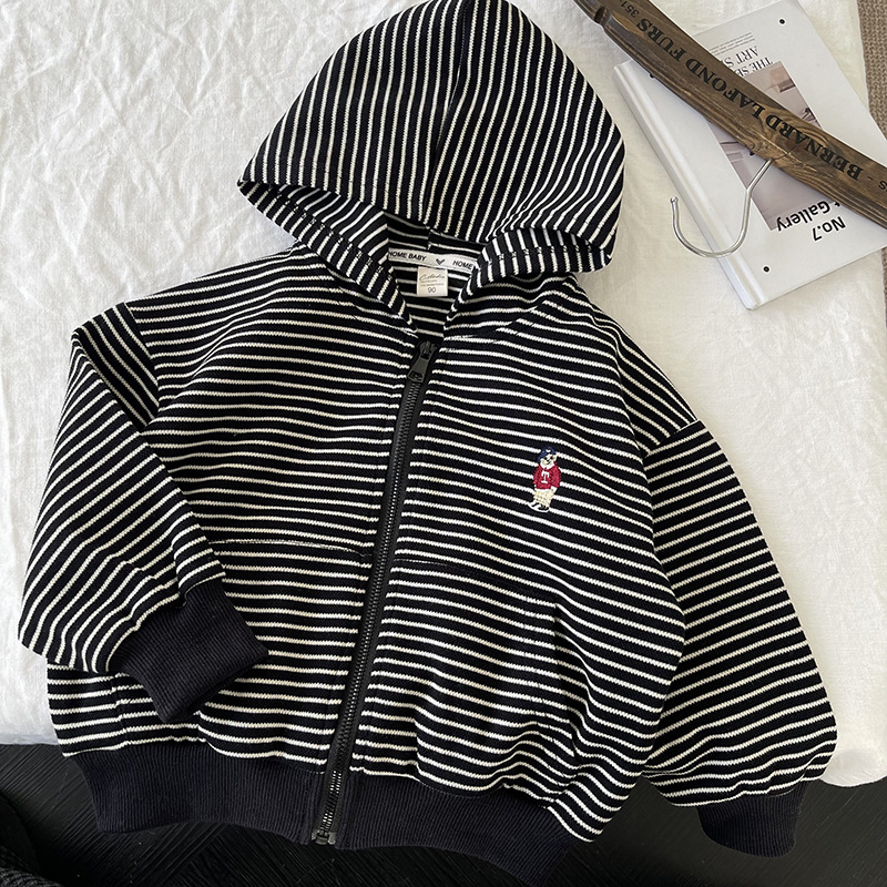 [산악경] 어린이 코트 2025 봄새 소년 · 소녀 후드줄무늬 카디건 코트 곰 자수스토어 가기