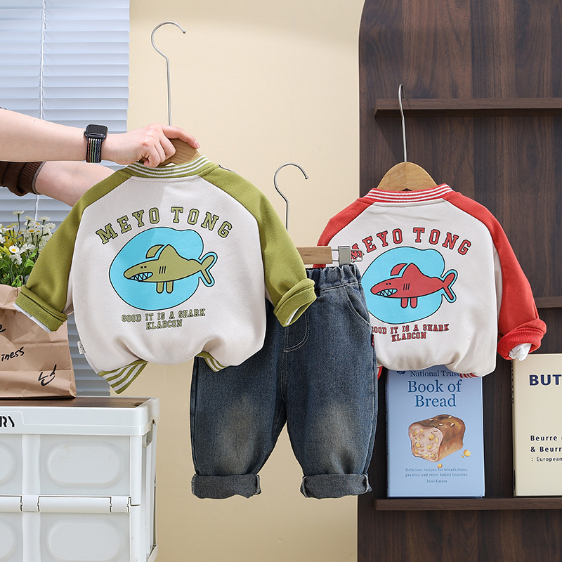 소년 가을 세트 2025 새로운 봄과 가을 서양식 코트 만화 상어 3 조각 세트 아기 잘 생긴 유행 옷스토어 가기