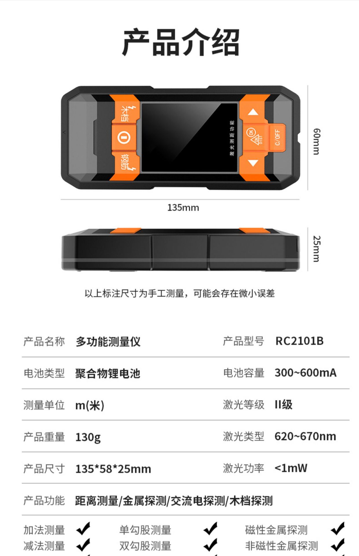 다기능 벽 탐지기 하중 베어링 벽 와이어 콘크리트 스틸 바 스캐너 금속 측정 기기 다크 라인