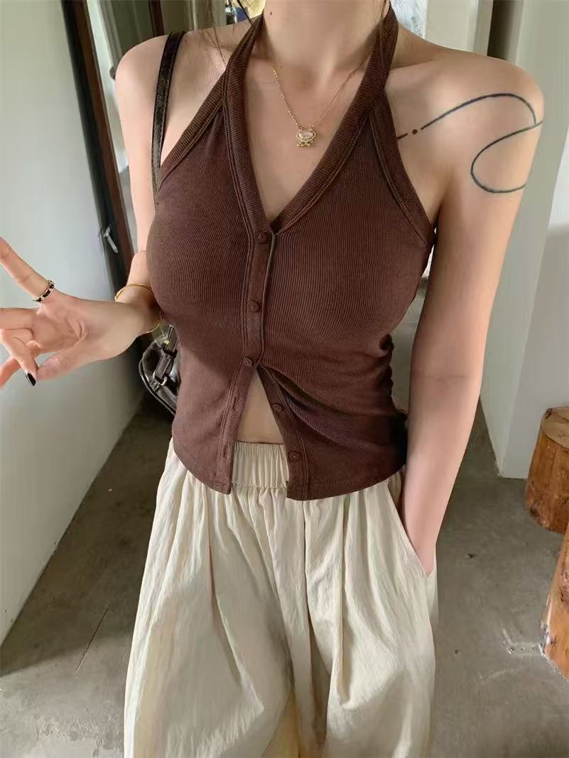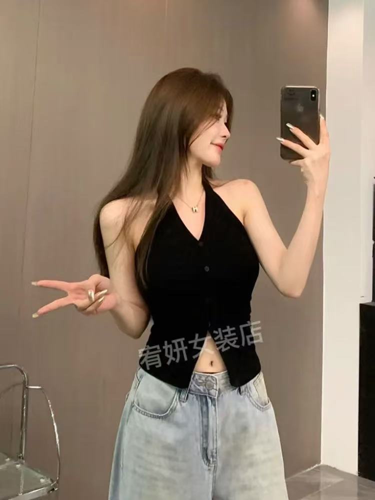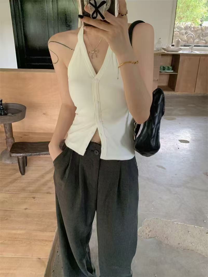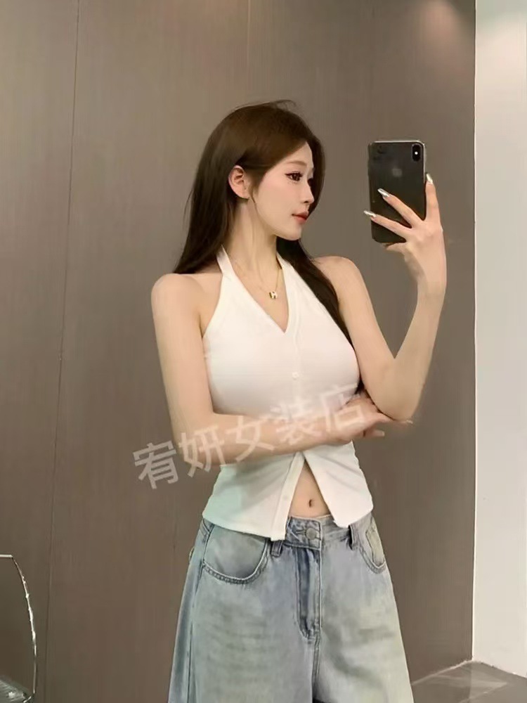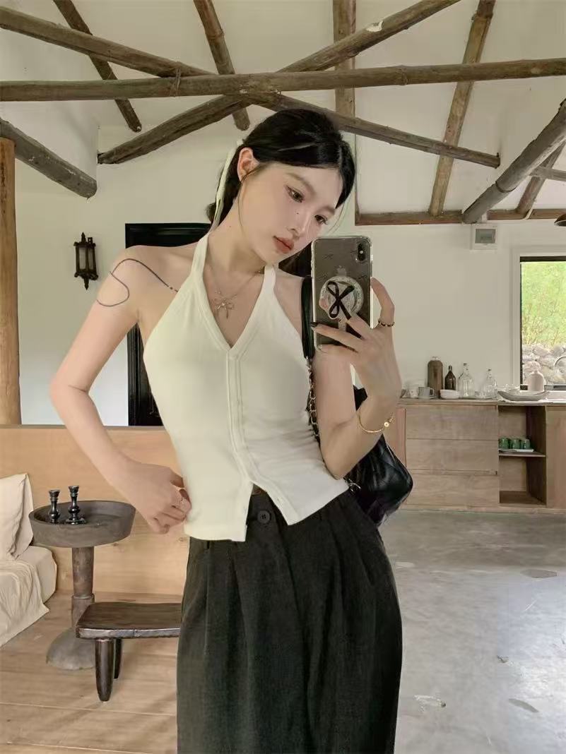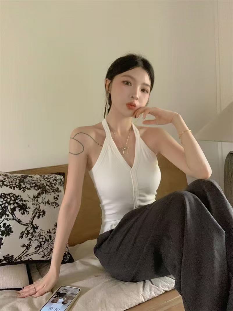 가슴 패드와 화이트 넥 조끼 여성 여름 외부 디자인 센스 틈새 세련된 아름다운 스파이스 소녀 민소매 탑