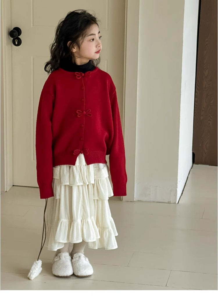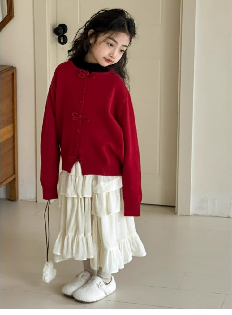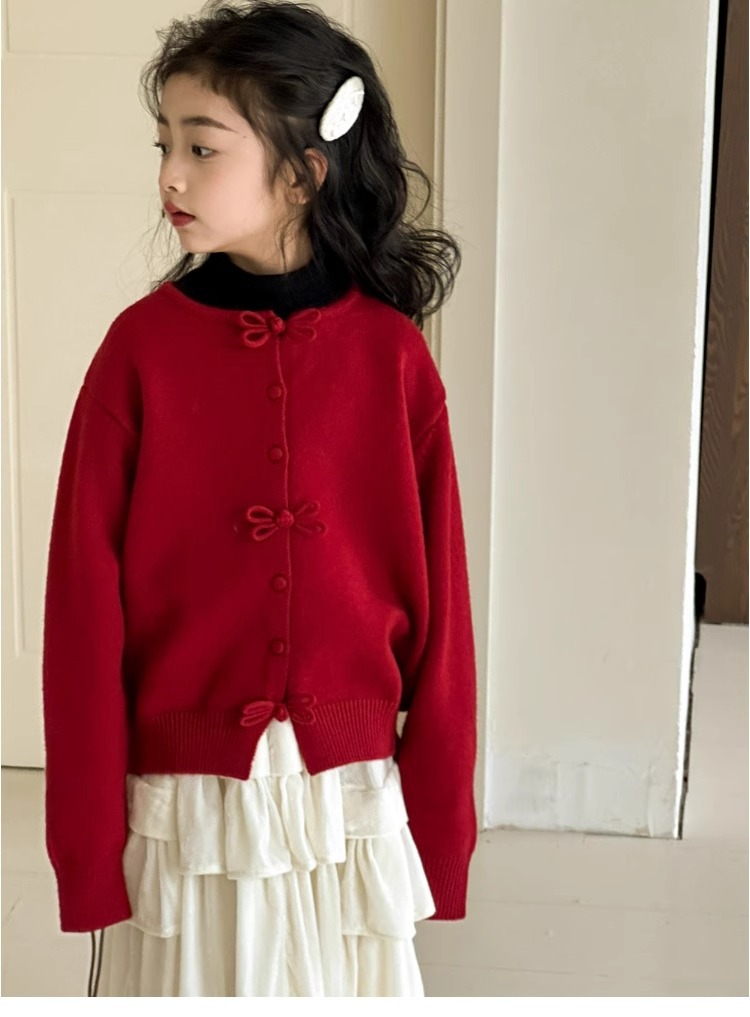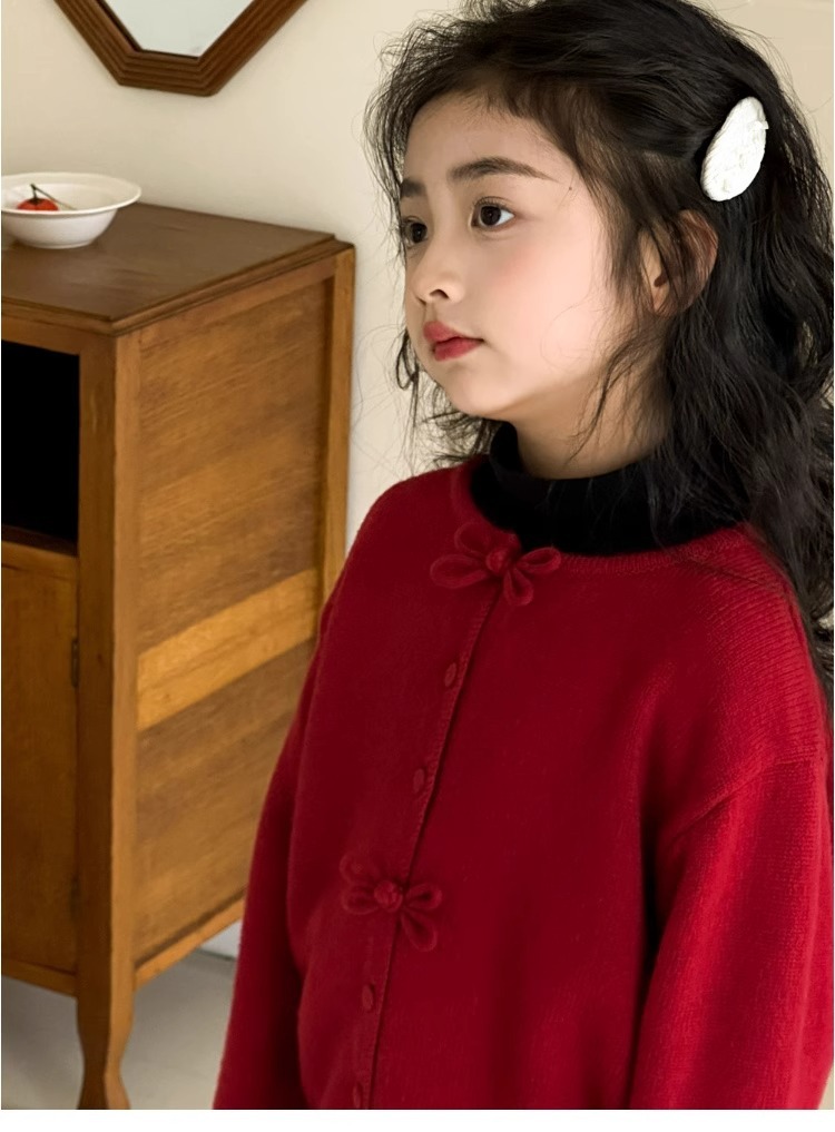 소녀 코트 2025 가을과 겨울 새로운 어린이 빨간 스웨터 새 구정 서비스 니트 스웨터 탑