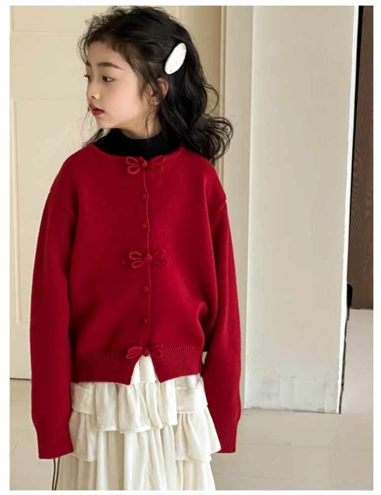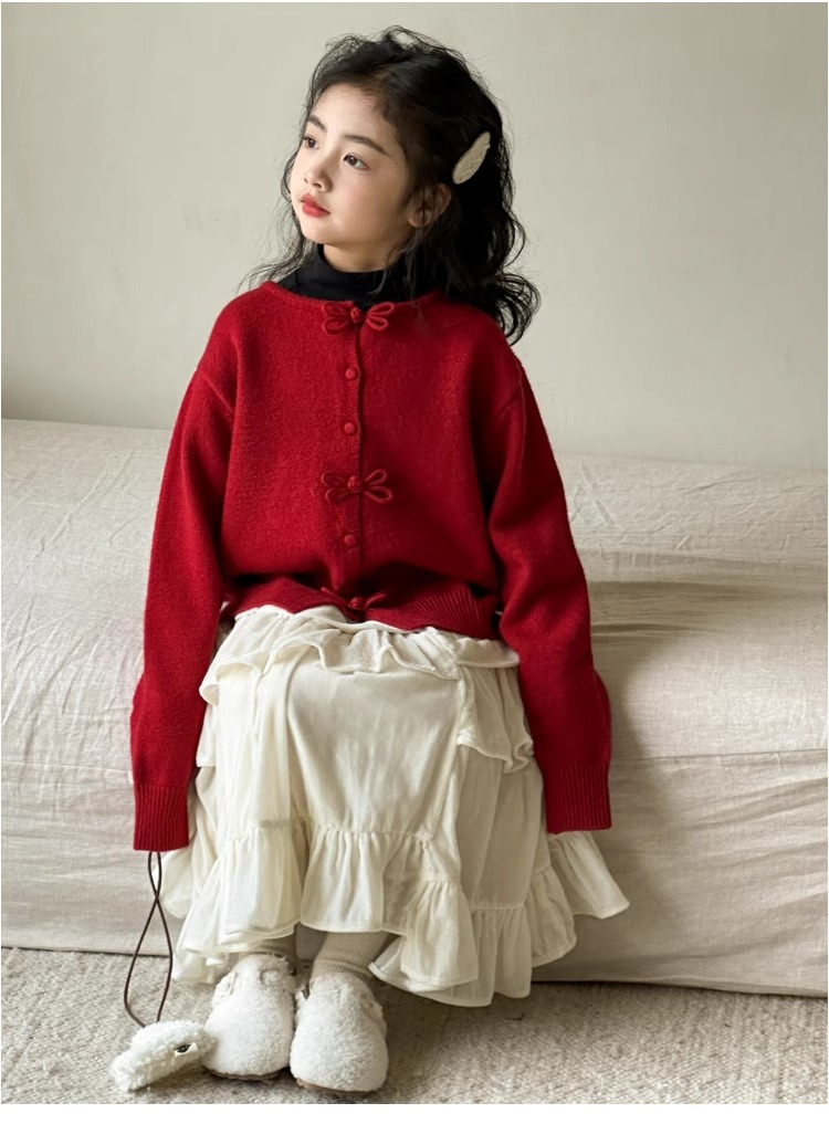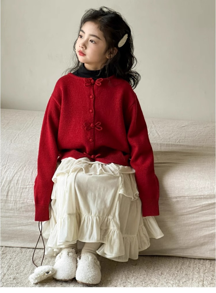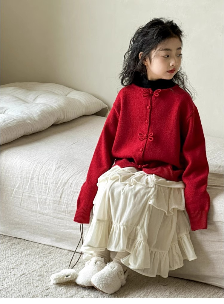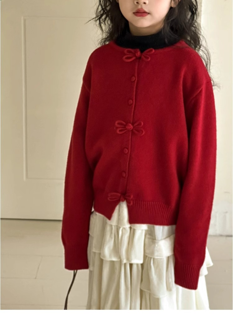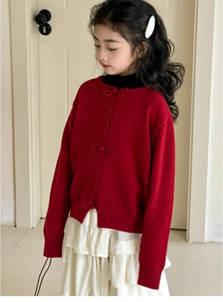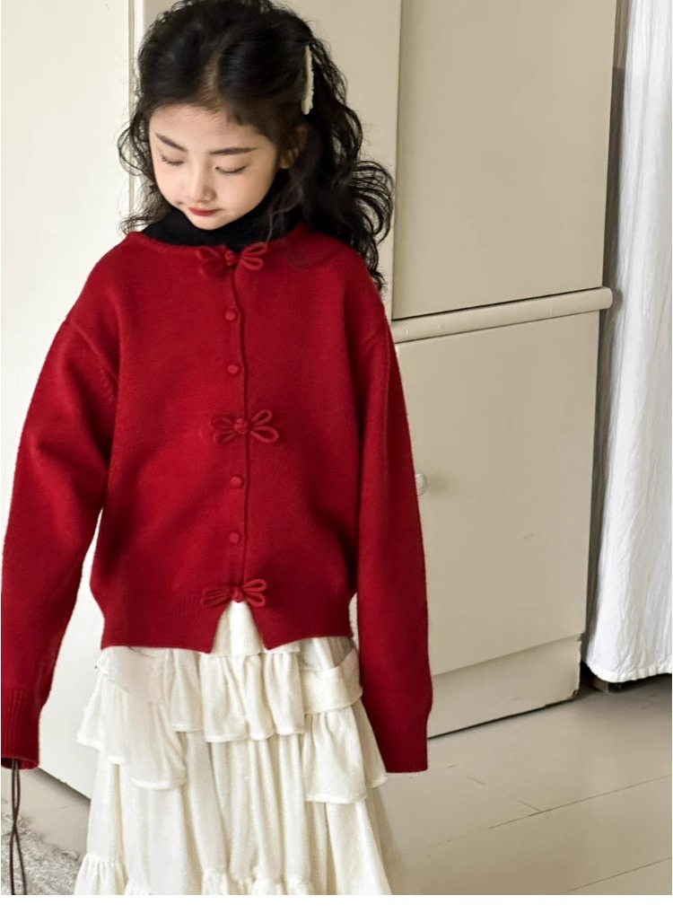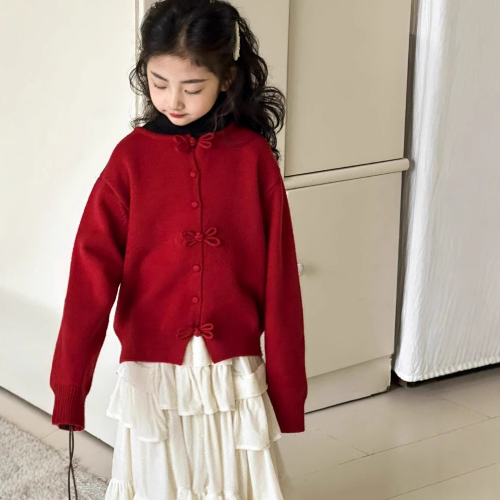 소녀 코트 2025 가을과 겨울 새로운 어린이 빨간 스웨터 새 구정 서비스 니트 스웨터 탑스토어 가기