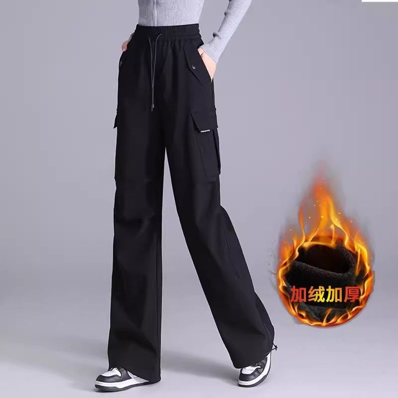 작업복 여성 겨울 2025 새로운 벨벳 바지 높은 허리 느슨한 직선 다리 넓은 다리 바지 스포츠 소박한 바지
