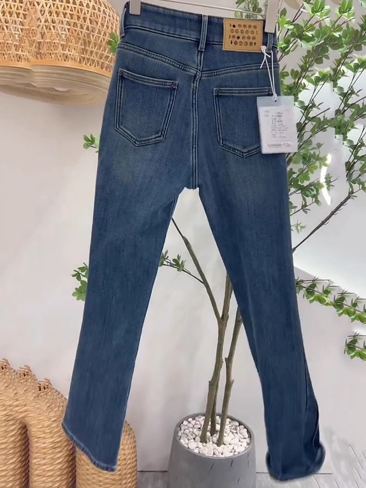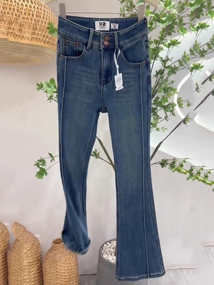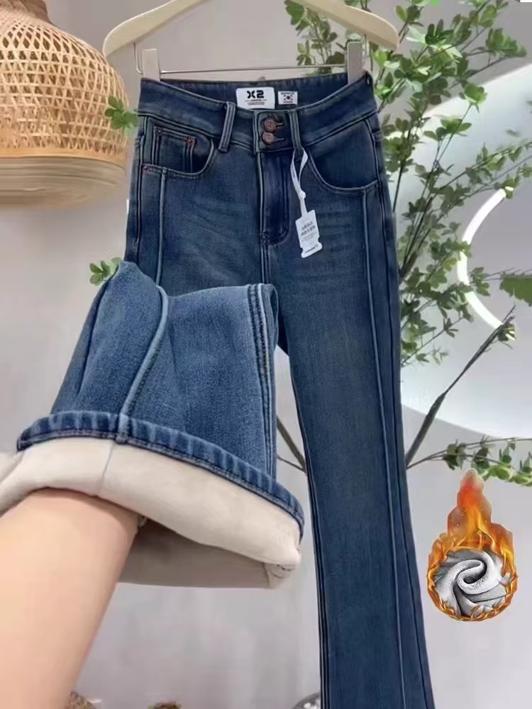 빈티지 블루 기모 청바지 여성의 가을과 겨울 새로운 도착 작은 높은 허리 슬림 룩 마이크로 라 청바지 데님 여성 트렌디스토어 가기