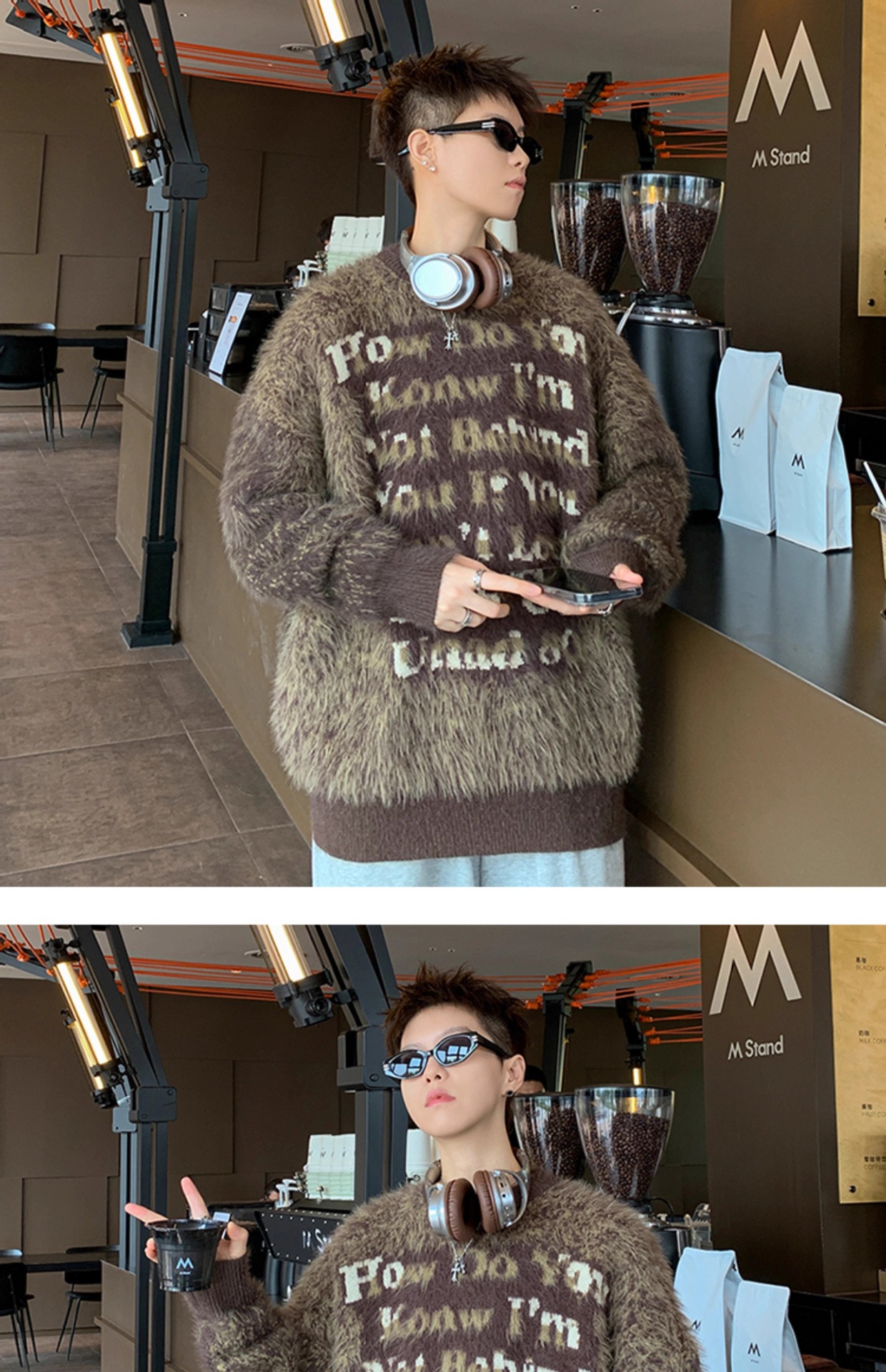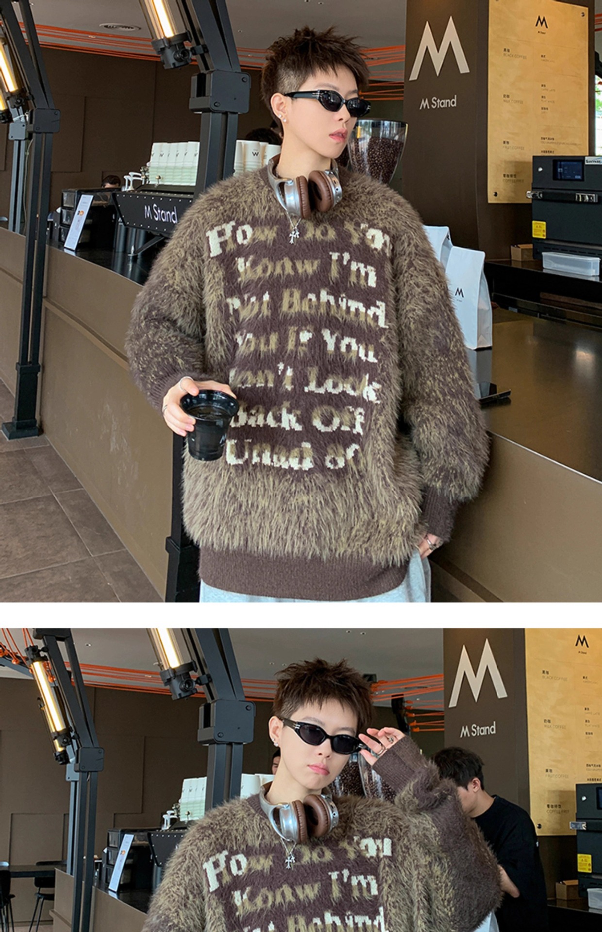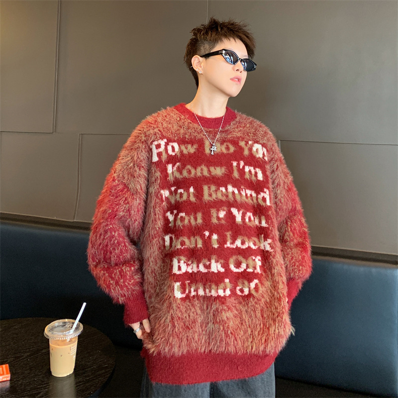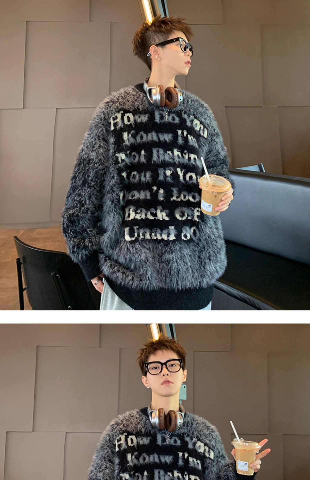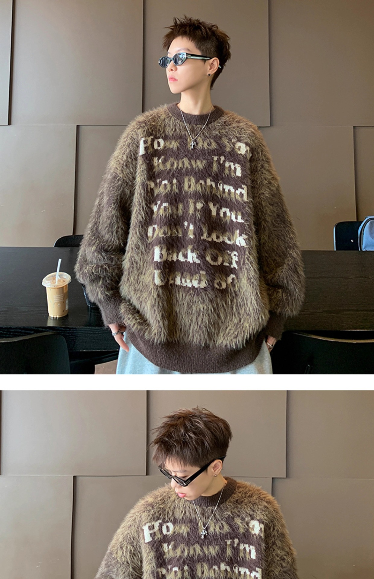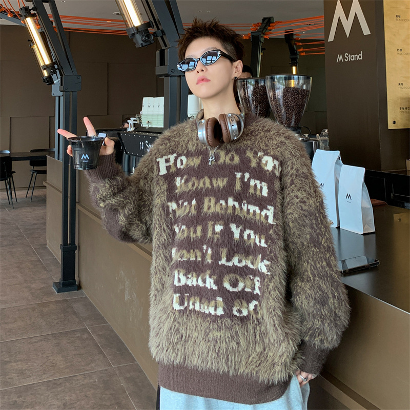 아메리칸 스타일 하이 스트리트 빈티지 편지 게으른 스타일 플러시 따뜻한 스웨터 남자 가을 겨울 모방 밍크 양털 느슨한 크루 넥 재킷