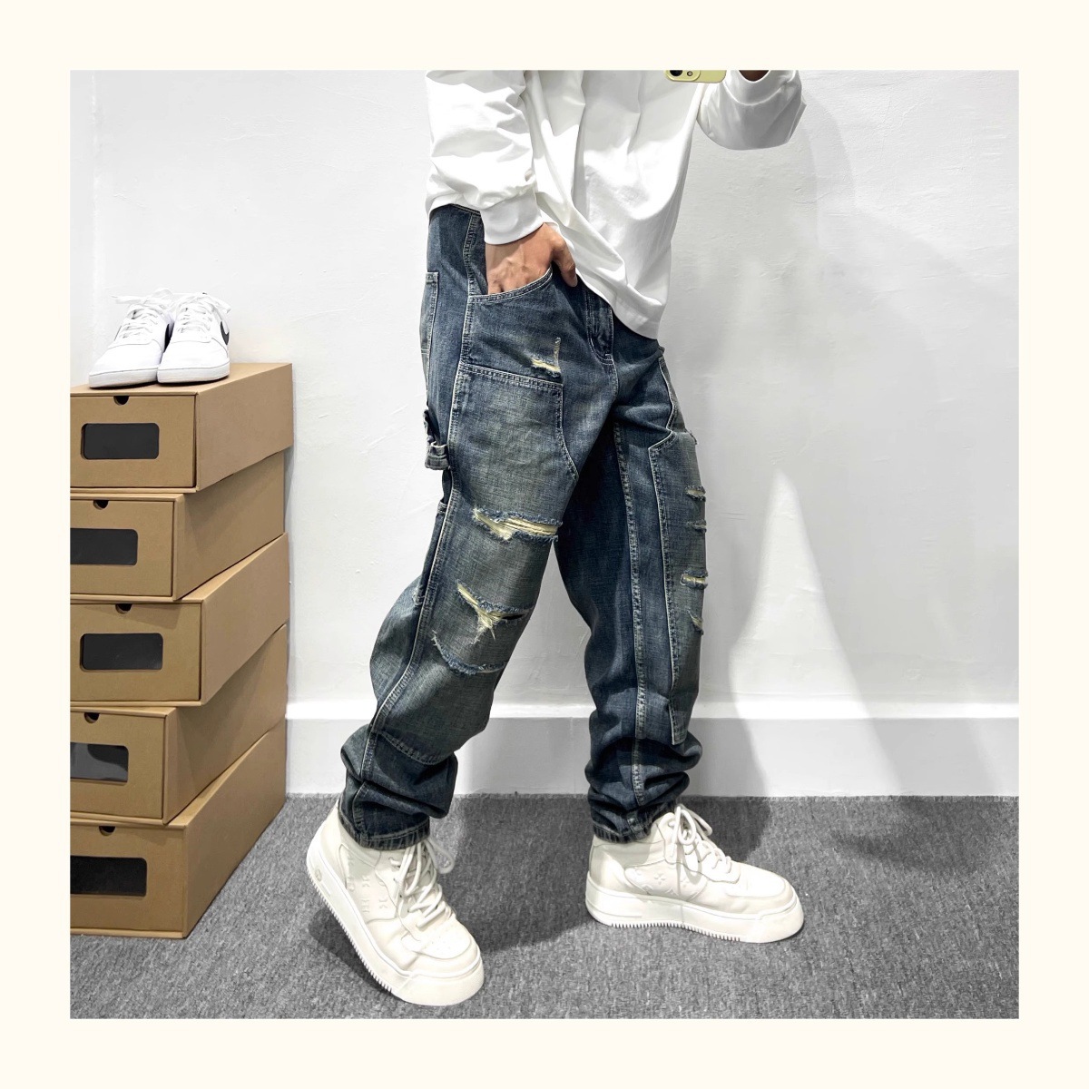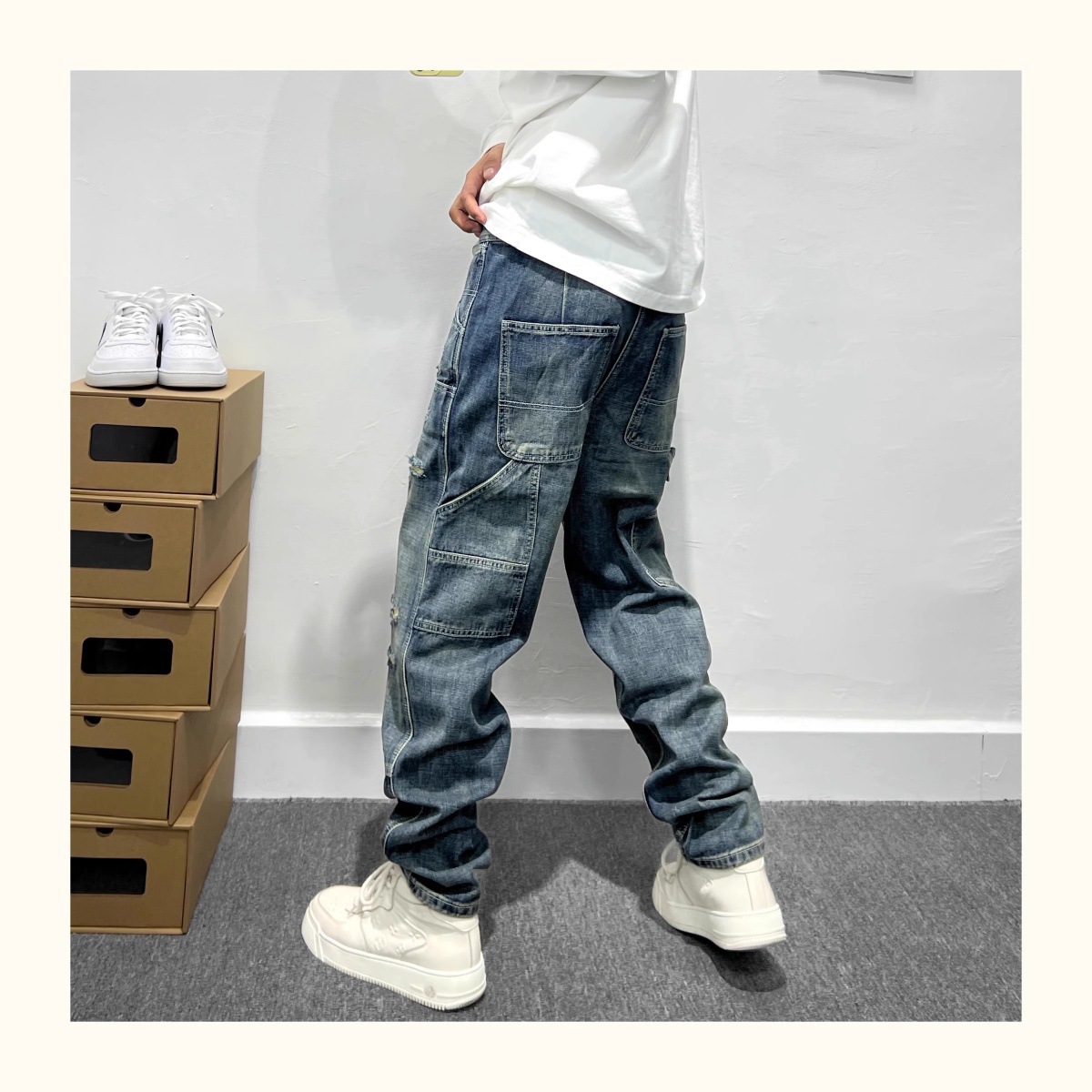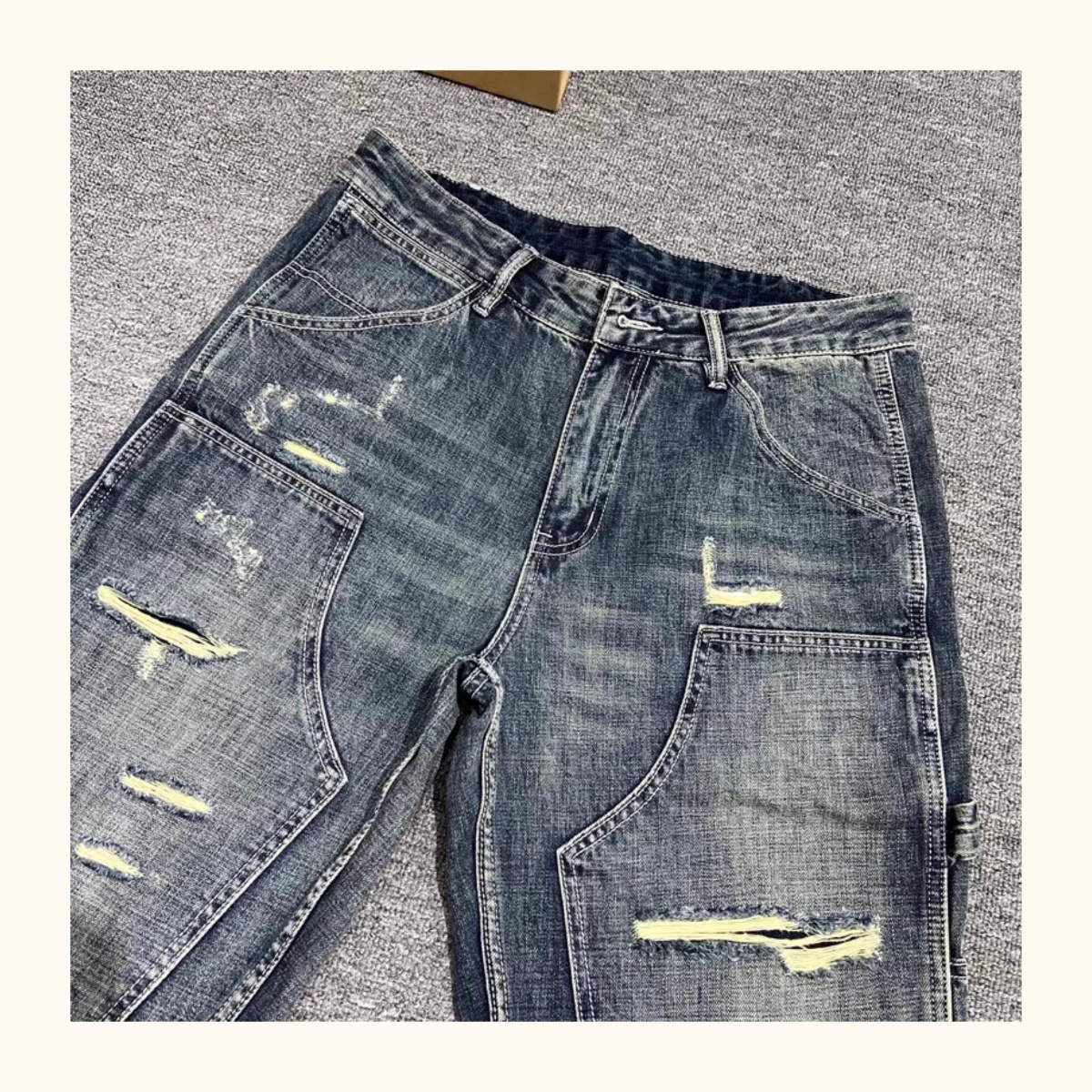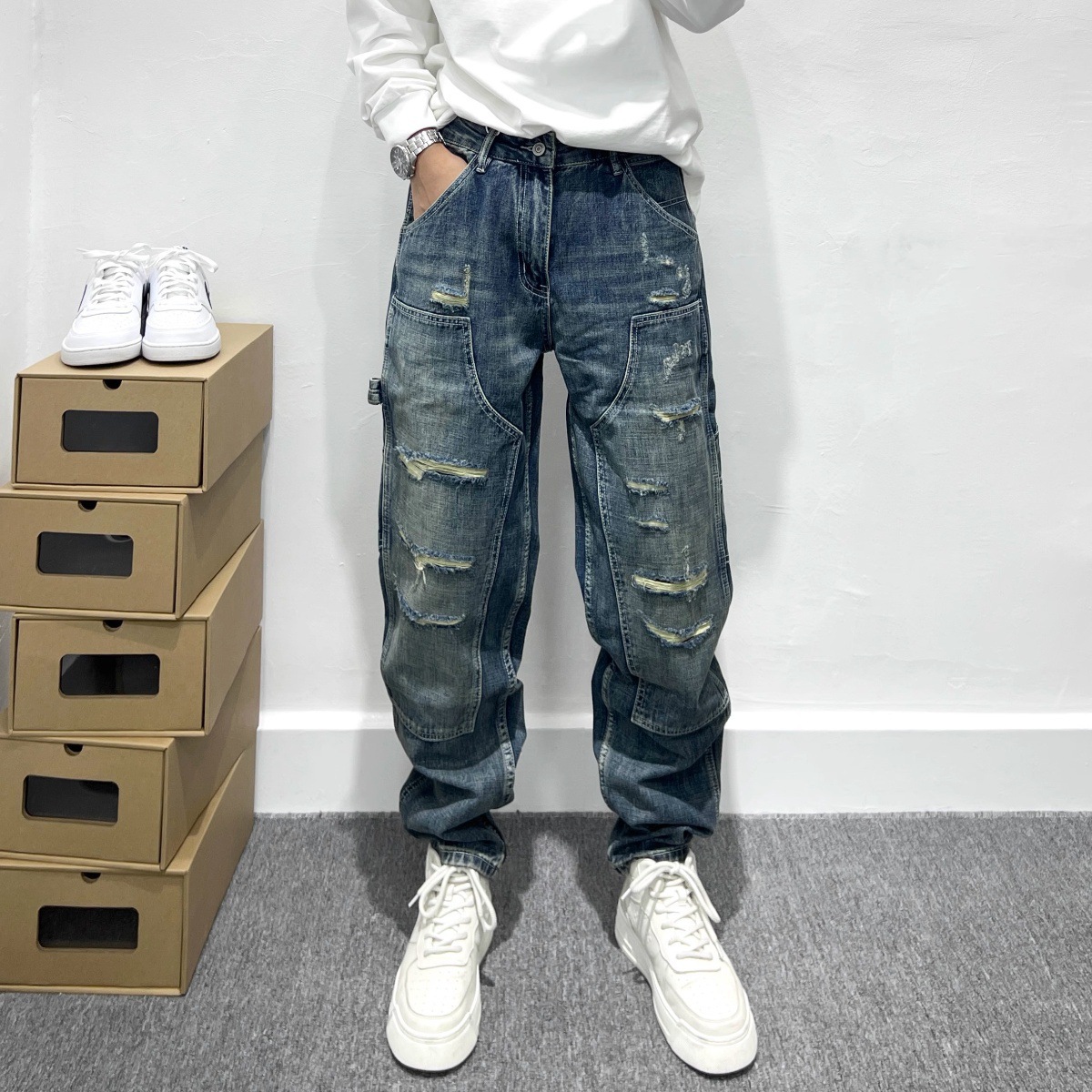 트렌디 한 브랜드 레트로 헤비 리핑 툴링 청바지 남성 아메리칸 스타일 하이 스트리트 느슨한 작은 스트레이트 바지 남성 테이퍼 바지스토어 가기