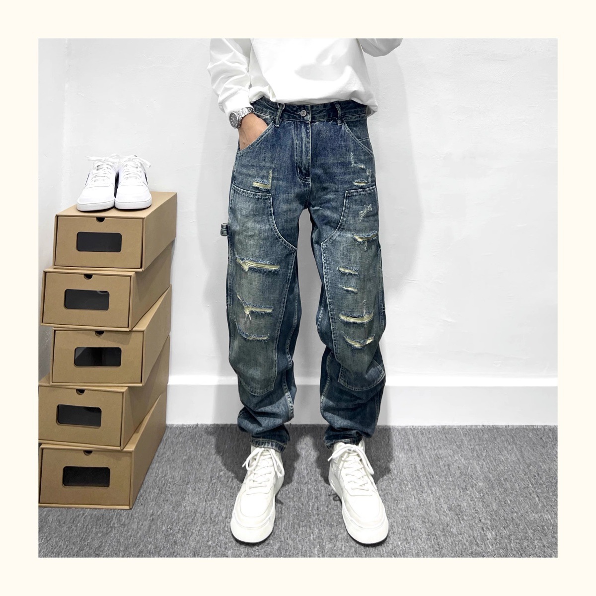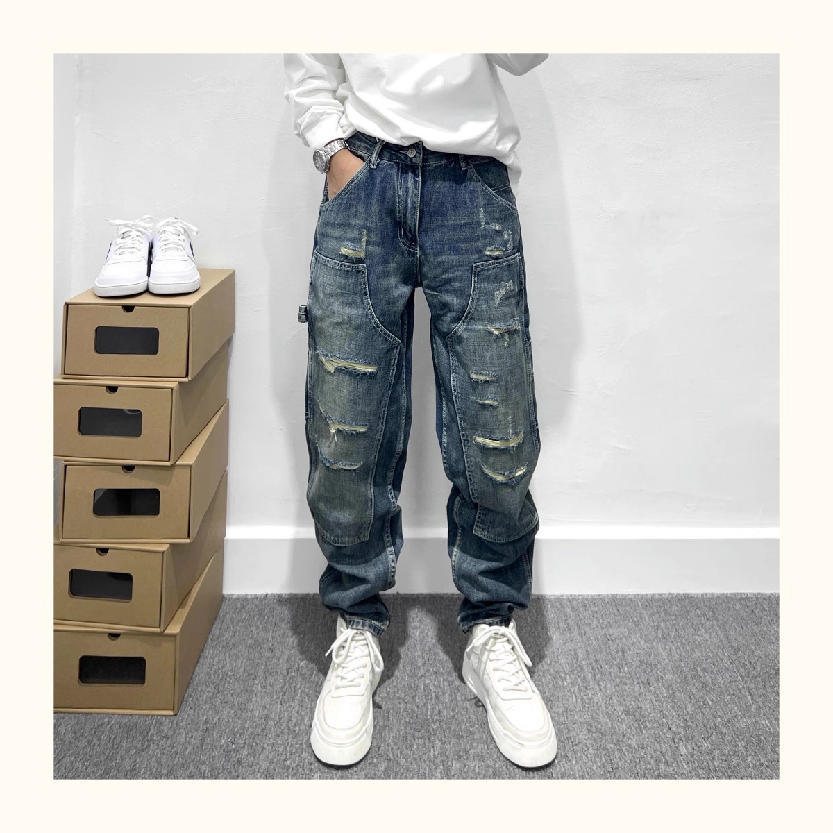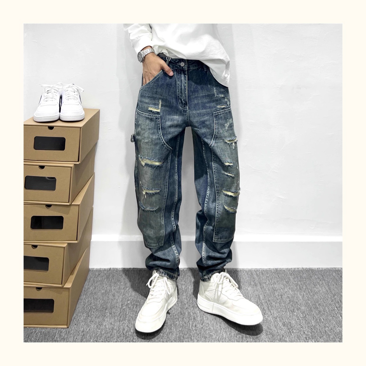 트렌디 한 브랜드 레트로 헤비 리핑 툴링 청바지 남성 아메리칸 스타일 하이 스트리트 느슨한 작은 스트레이트 바지 남성 테이퍼 바지스토어 가기